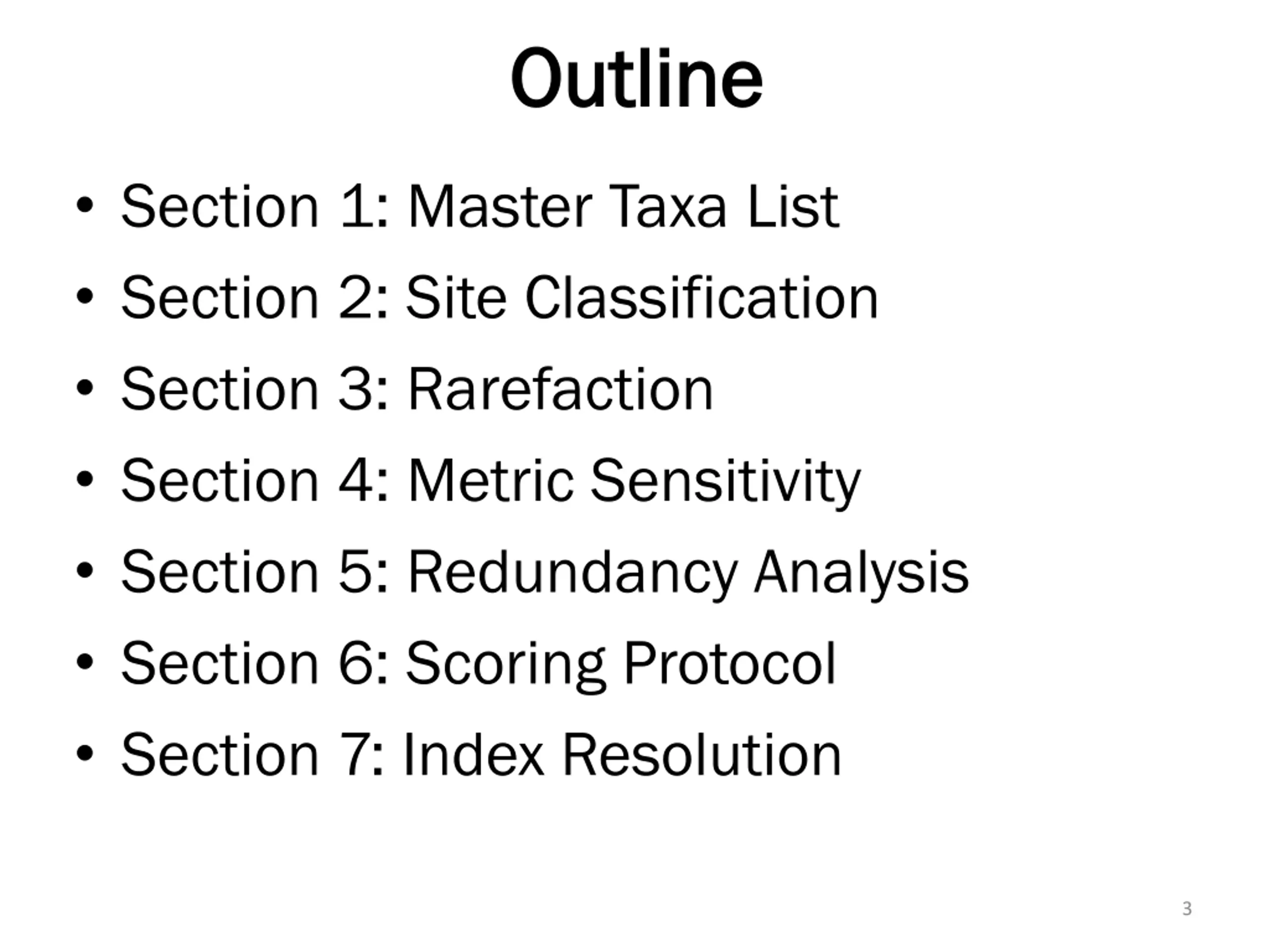 Outline Outline Section 1: Master Taxa List Section 2: Site Classification Section 3: Rarefaction Section 4: Metric Sensitivity Section 5: Redundancy Analysis Section 6: Scoring Protocol Section 7: Index Resolution 3