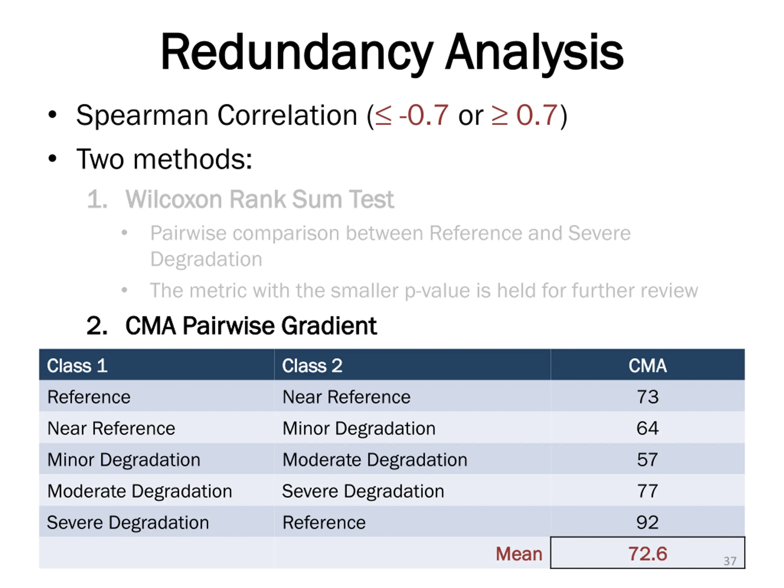 Redundancy Analysis Redundancy Analysis Spearman Correlation ( -0.7 or 0.7) Two methods: 1. 1. Wilcoxon Rank Sum Test Wilcoxon Rank Sum Test Pairwise comparison between Reference and Severe Degradation The metric with the smaller p-value is held for further review 2. 2. CMA Pairwise Gradient CMA Pairwise Gradient Class 1 Class 1 Reference Near Reference Minor Degradation Moderate Degradation Severe Degradation Class 2 Class 2 Near Reference Minor Degradation Moderate Degradation Severe Degradation Reference CMA CMA 73 64 57 77 92 72.6 72.6 Mean Mean 37