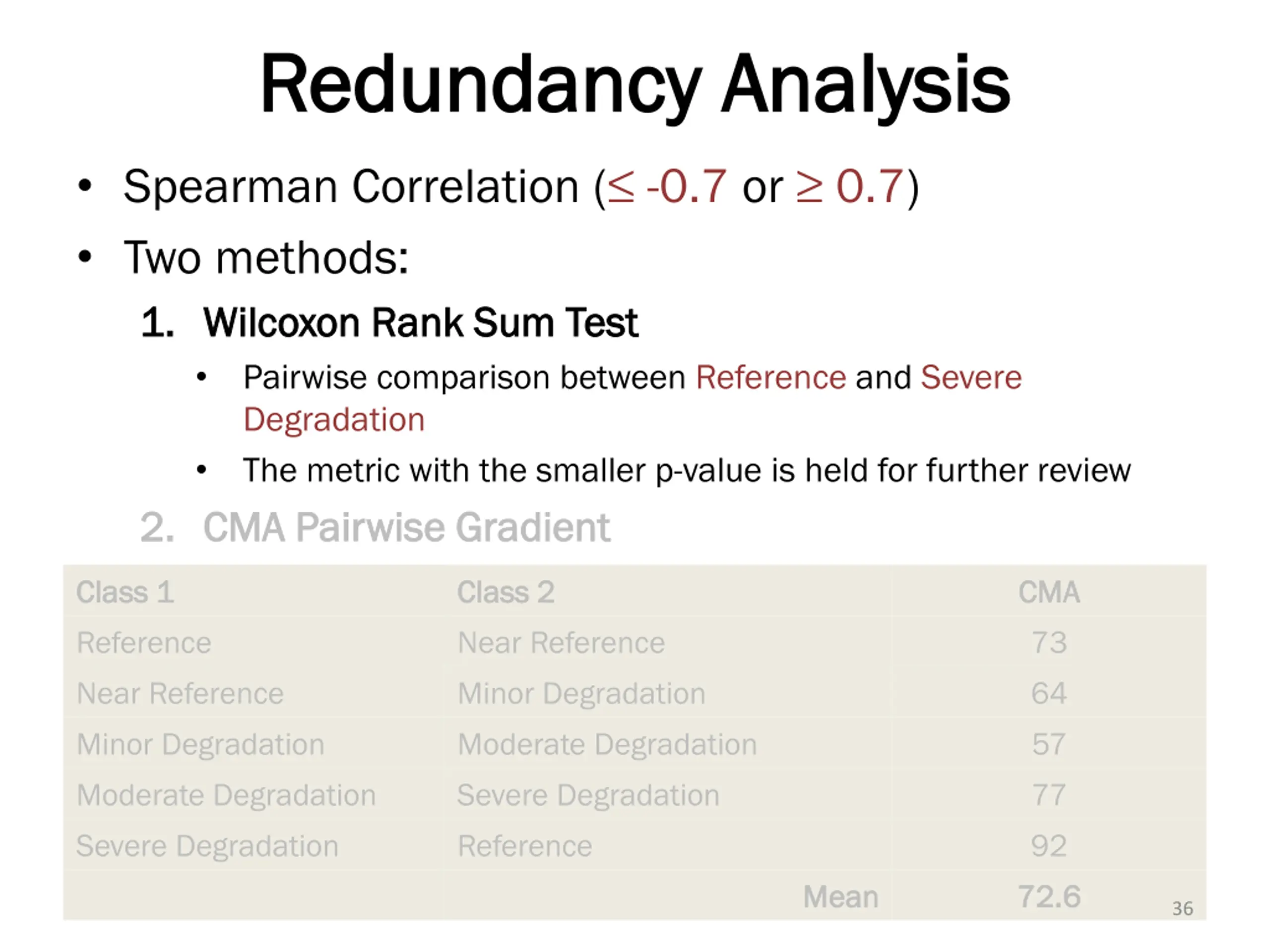 Redundancy Analysis Redundancy Analysis Spearman Correlation ( -0.7 or 0.7) Two methods: 1. 1. Wilcoxon Rank Sum Test Wilcoxon Rank Sum Test Pairwise comparison between Reference and Severe Degradation The metric with the smaller p-value is held for further review 2. 2. CMA Pairwise Gradient CMA Pairwise Gradient Class 1 Class 1 Reference Near Reference Minor Degradation Moderate Degradation Severe Degradation Class 2 Class 2 Near Reference Minor Degradation Moderate Degradation Severe Degradation Reference CMA CMA 73 64 57 77 92 72.6 72.6 Mean Mean 36