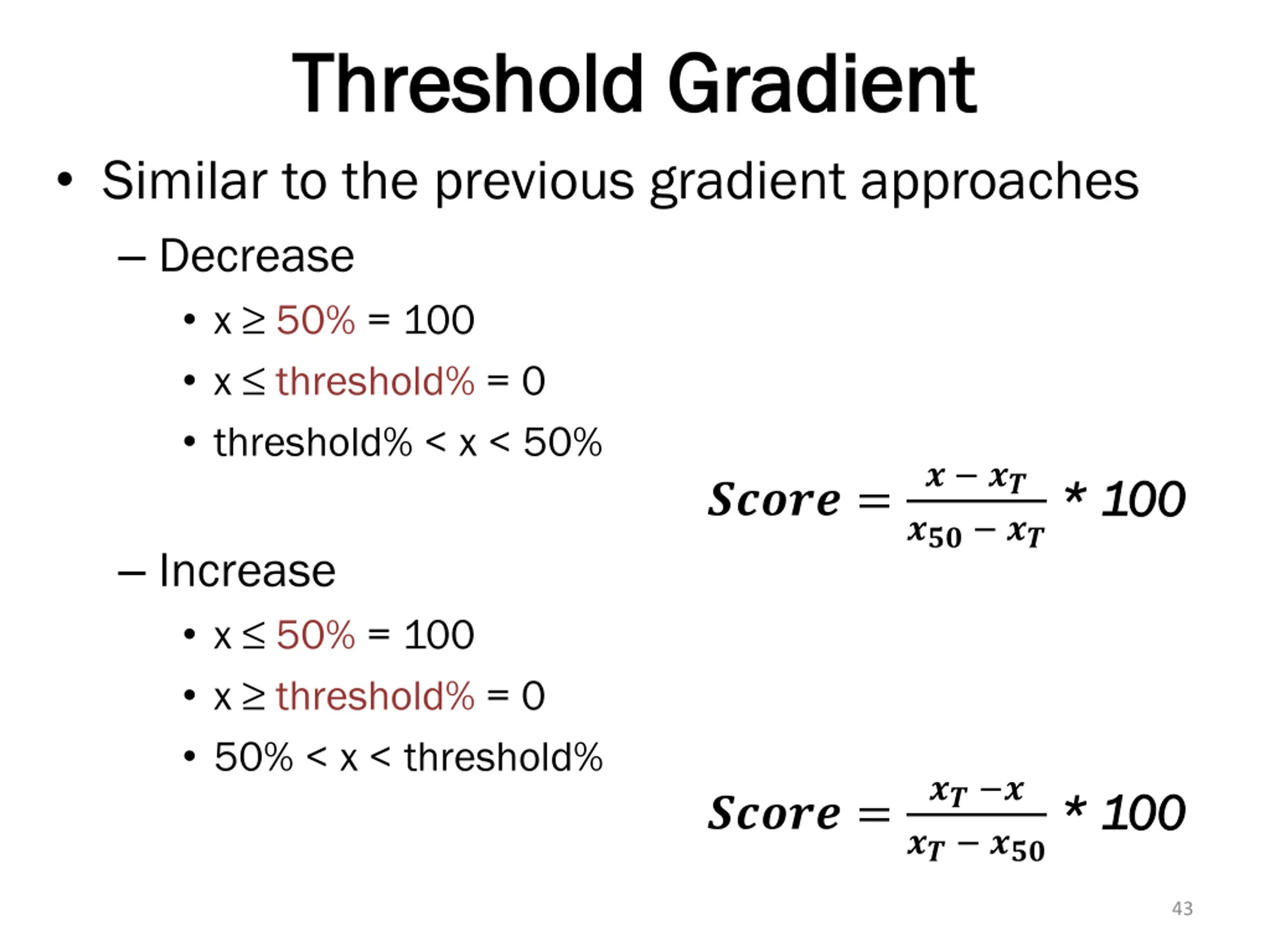 Threshold Gradient Threshold Gradient Similar to the previous gradient approaches Decrease x 50% = 100 x threshold% = 0 threshold% < x < 50% ? ?? ??? ?? * 100 * 100 ????? = Increase x 50% = 100 x threshold% = 0 50% < x < threshold% ?? ? ?? ??? * 100 * 100 ????? = 43