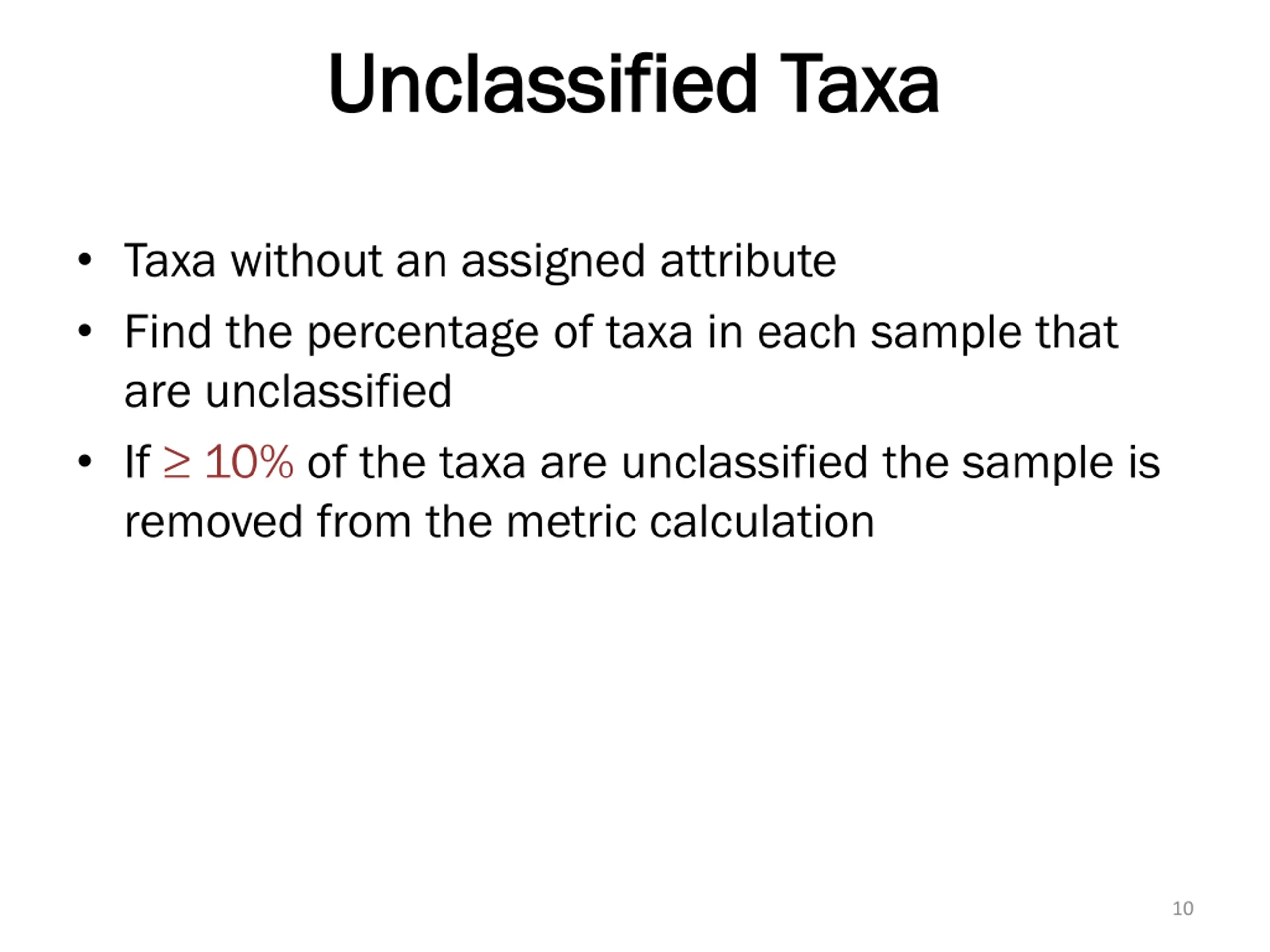 Unclassified Taxa Unclassified Taxa Taxa without an assigned attribute Find the percentage of taxa in each sample that are unclassified If 10% of the taxa are unclassified the sample is removed from the metric calculation 10