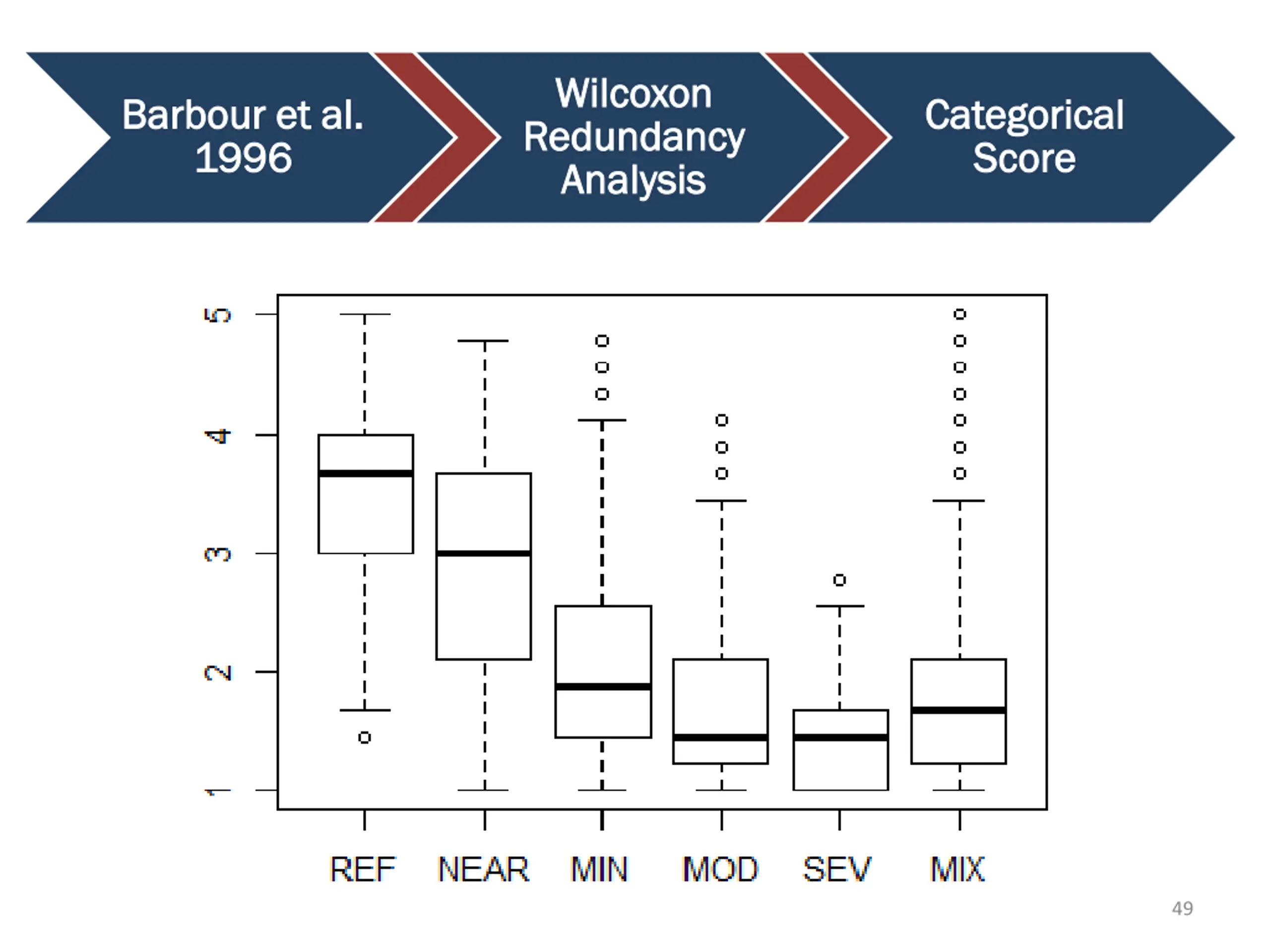 Metric Metric Sensitivity Sensitivity Approach Approach Barbour Barbour et al. et al. 1996 1996 Confusion Matrix Accuracy (CMA) Quantile Threshold Redundancy Redundancy Analysis Analysis Approach Approach Wilcoxon Rank Wilcoxon Rank Sum Test Sum Test Pairwise Confusion Matrix Accuracy (CMA) Scoring Scoring Approach Approach All Ref. Threshold Gradient Categorical Categorical Gradient Gradient 48