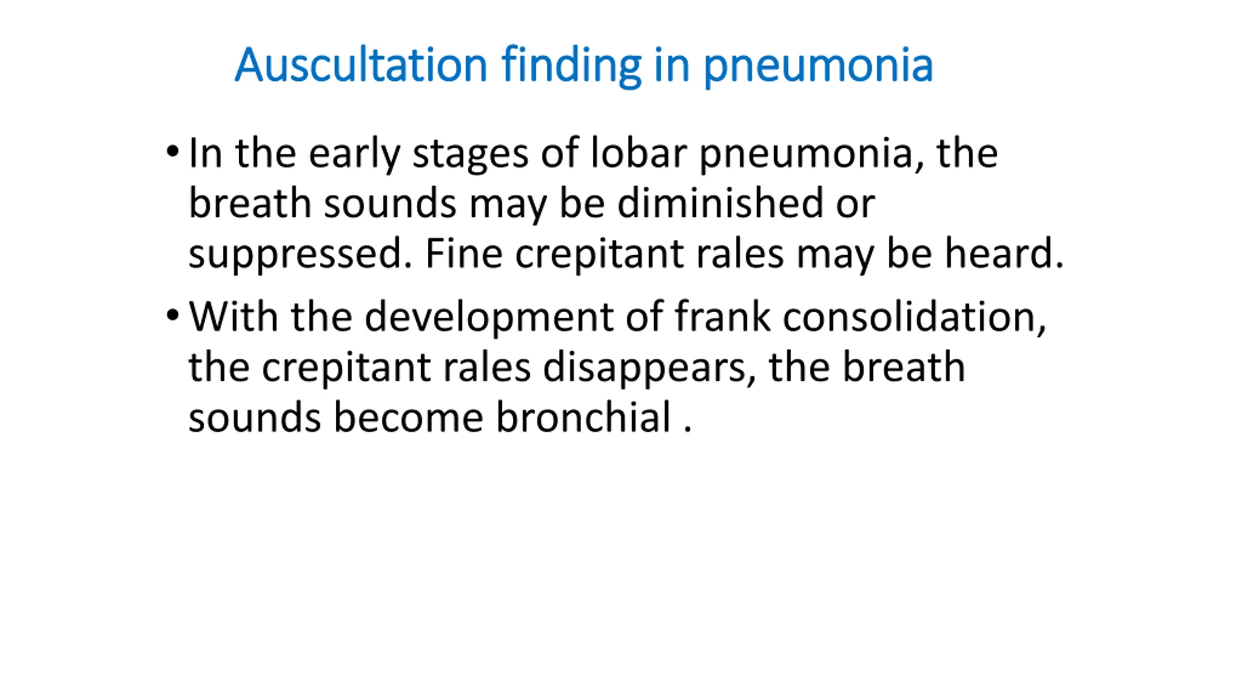 Auscultation Auscultation finding in pneumonia finding in pneumonia In the early stages of lobar pneumonia, the breath sounds may be diminished or suppressed. Fine crepitant rales may be heard. With the development of frank consolidation, the crepitant rales disappears, the breath sounds become bronchial .