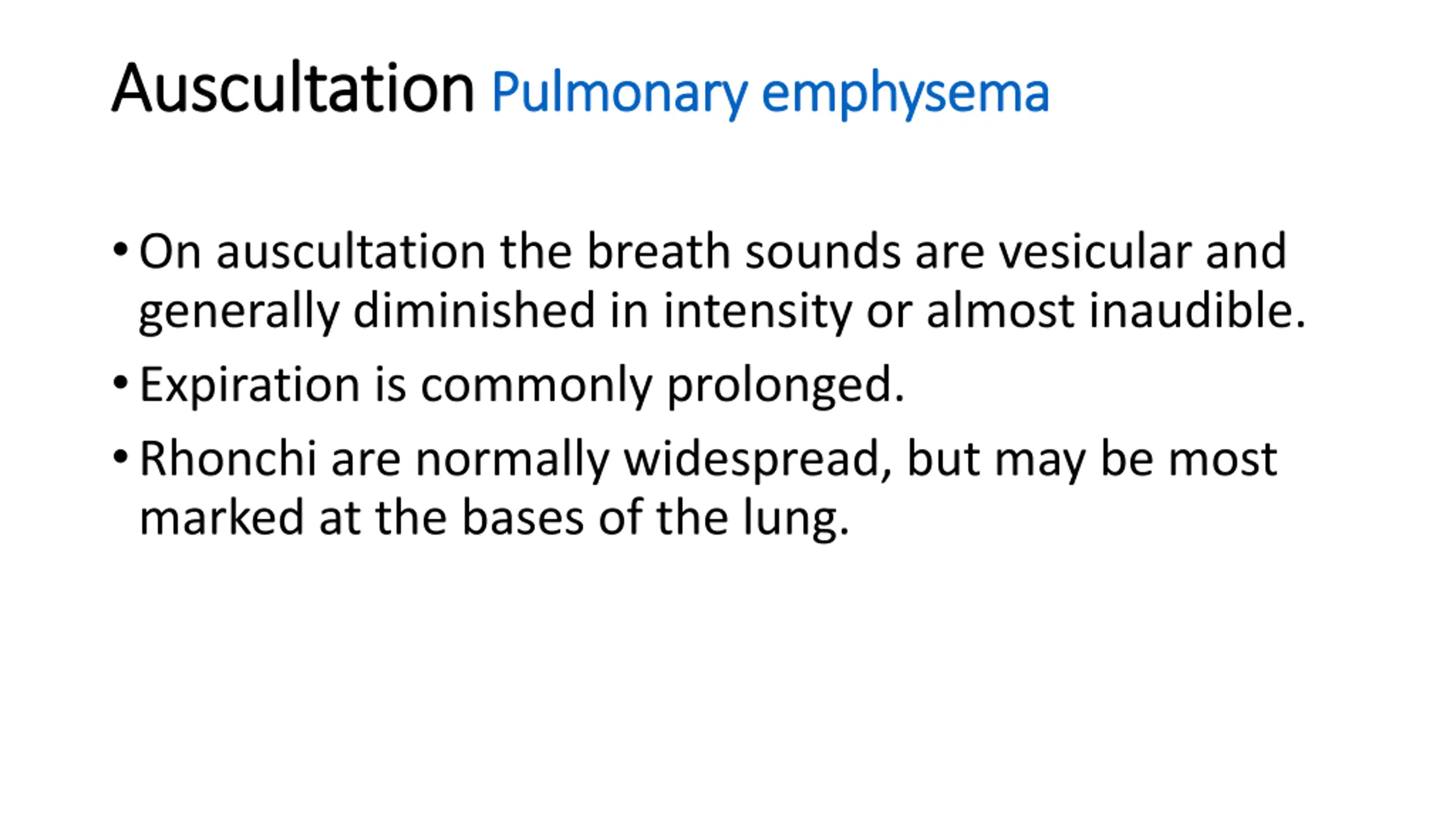Auscultation Auscultation Pulmonary emphysema Pulmonary emphysema On auscultation the breath sounds are vesicular and generally diminished in intensity or almost inaudible. Expiration is commonly prolonged. Rhonchi are normally widespread, but may be most marked at the bases of the lung.