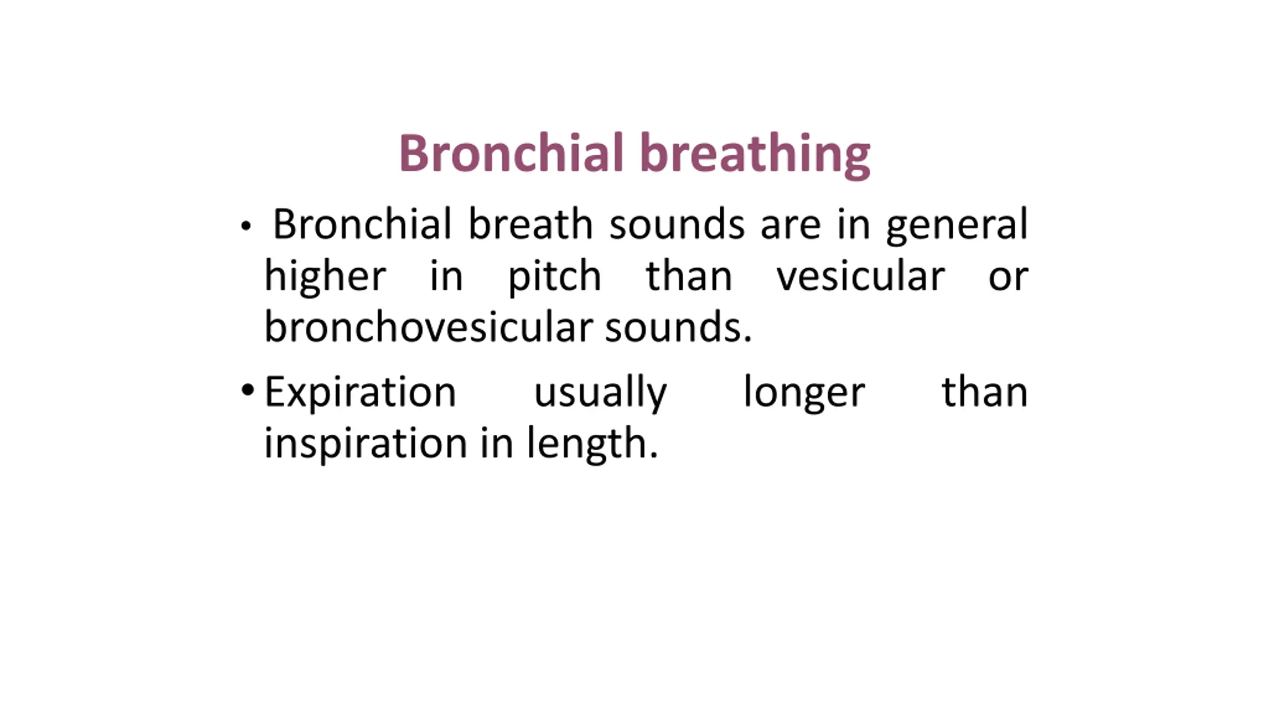 Bronchial breathing Bronchial breath sounds are in general higher in pitch than vesicular or bronchovesicular sounds. Expiration usually inspiration in length. longer than