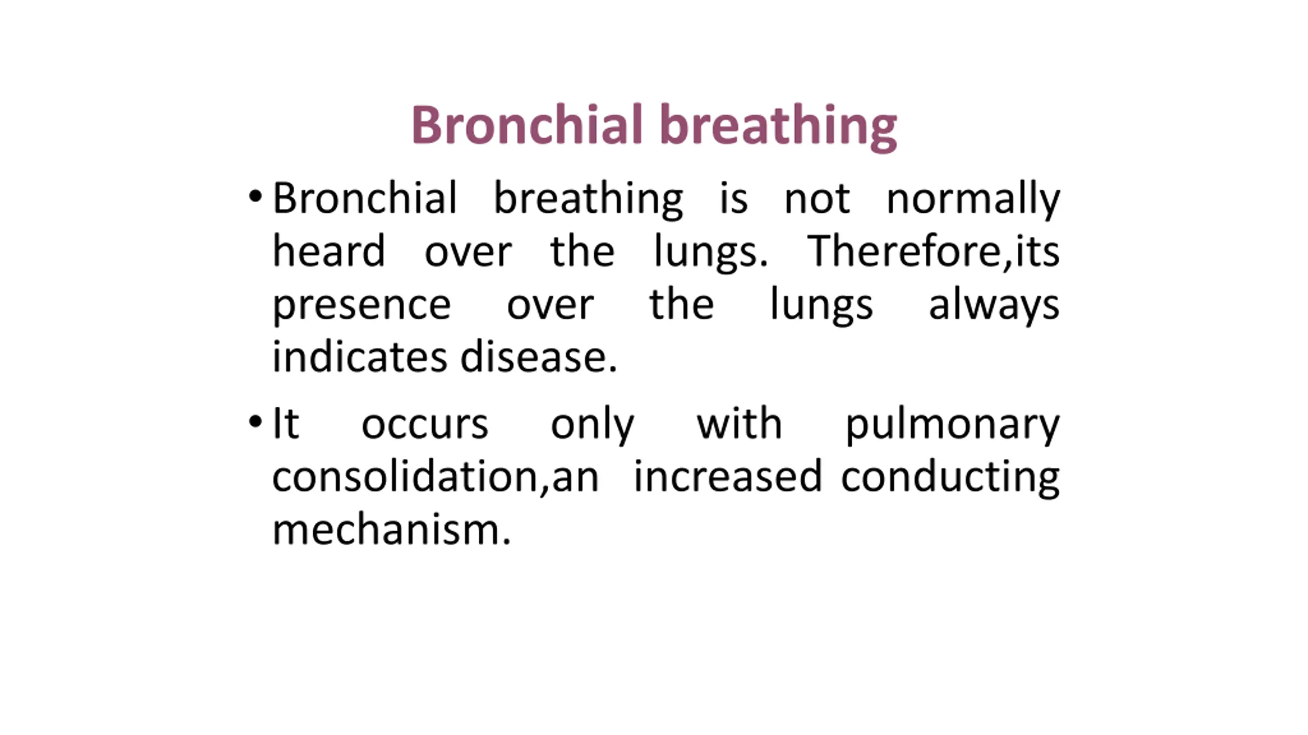 Bronchial breathing Bronchial breathing is not normally heard over the lungs. Therefore,its presence over the indicates disease. It occurs only consolidation,an increased conducting mechanism. lungs always with pulmonary