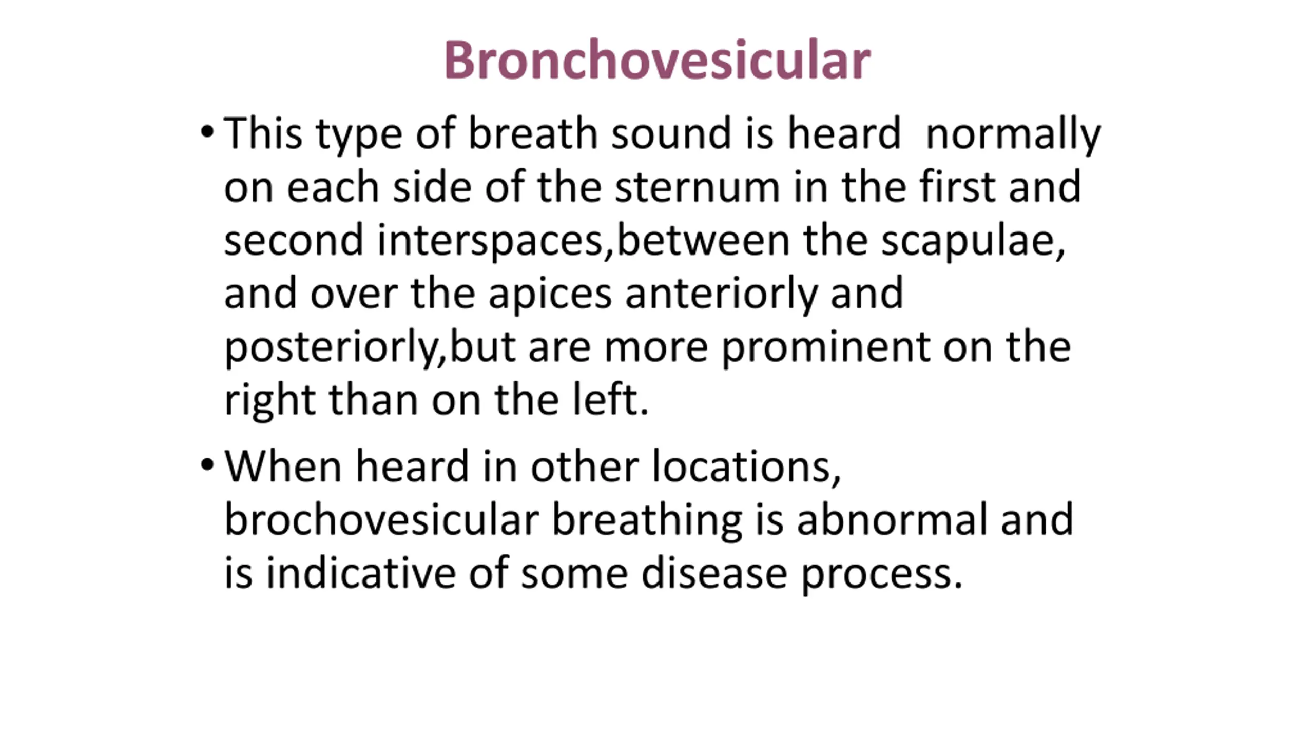 Bronchovesicular This type of breath sound is heard normally on each side of the sternum in the first and second interspaces,between the scapulae, and over the apices anteriorly and posteriorly,but are more prominent on the right than on the left. When heard in other locations, brochovesicular breathing is abnormal and is indicative of some disease process.