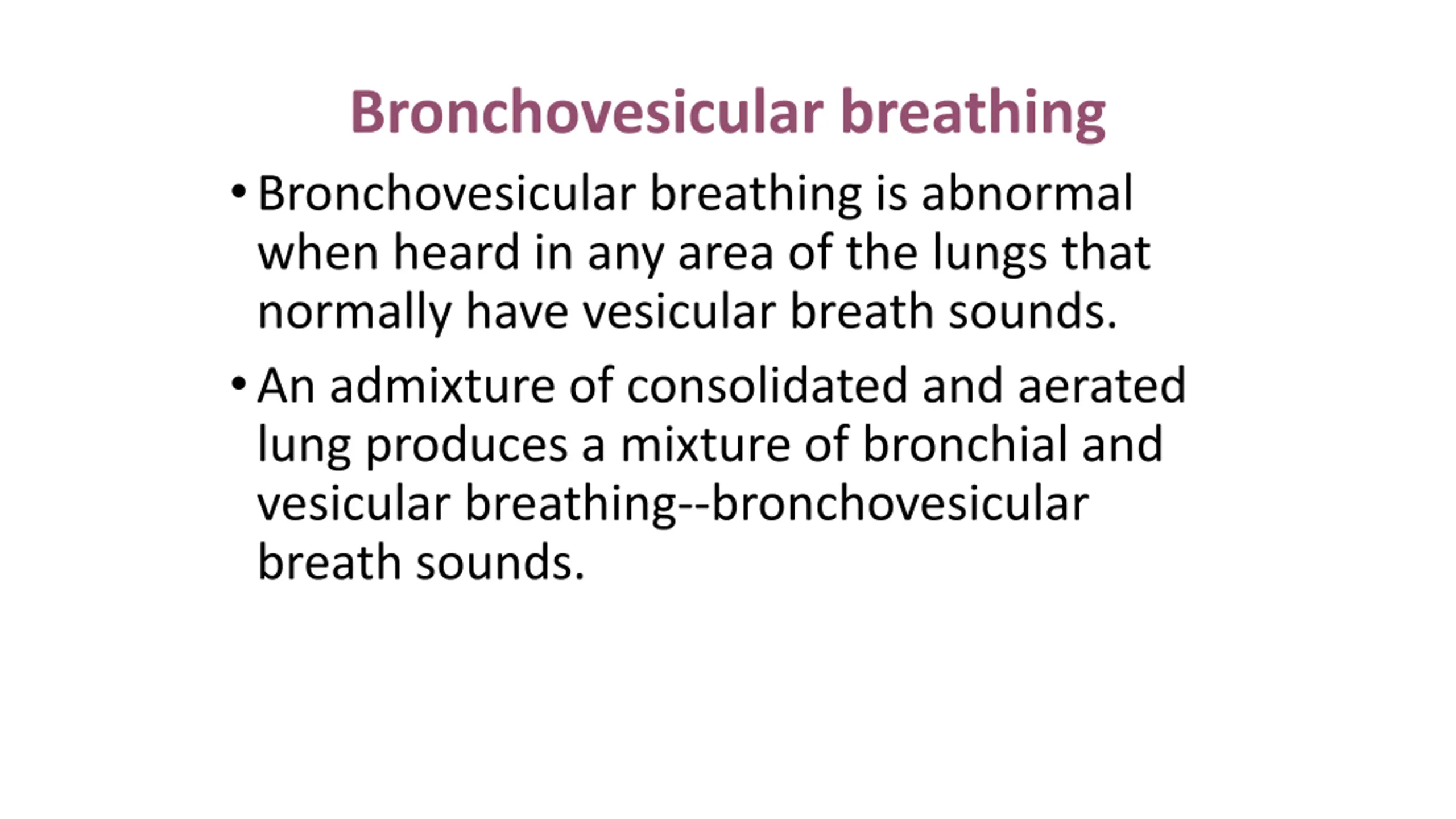 Bronchovesicular breathing Bronchovesicular breathing is abnormal when heard in any area of the lungs that normally have vesicular breath sounds. An admixture of consolidated and aerated lung produces a mixture of bronchial and vesicular breathing--bronchovesicular breath sounds.