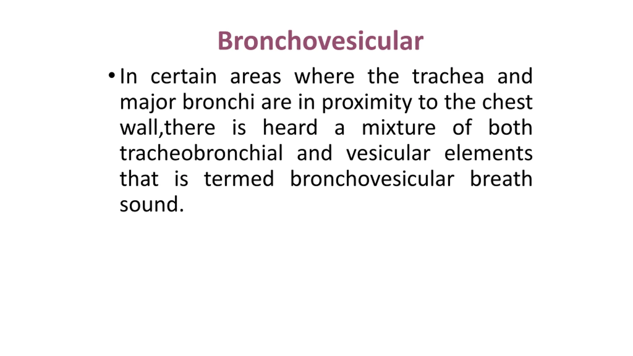 Bronchovesicular In certain areas where the trachea and major bronchi are in proximity to the chest wall,there is heard a mixture of both tracheobronchial and vesicular elements that is termed bronchovesicular breath sound.
