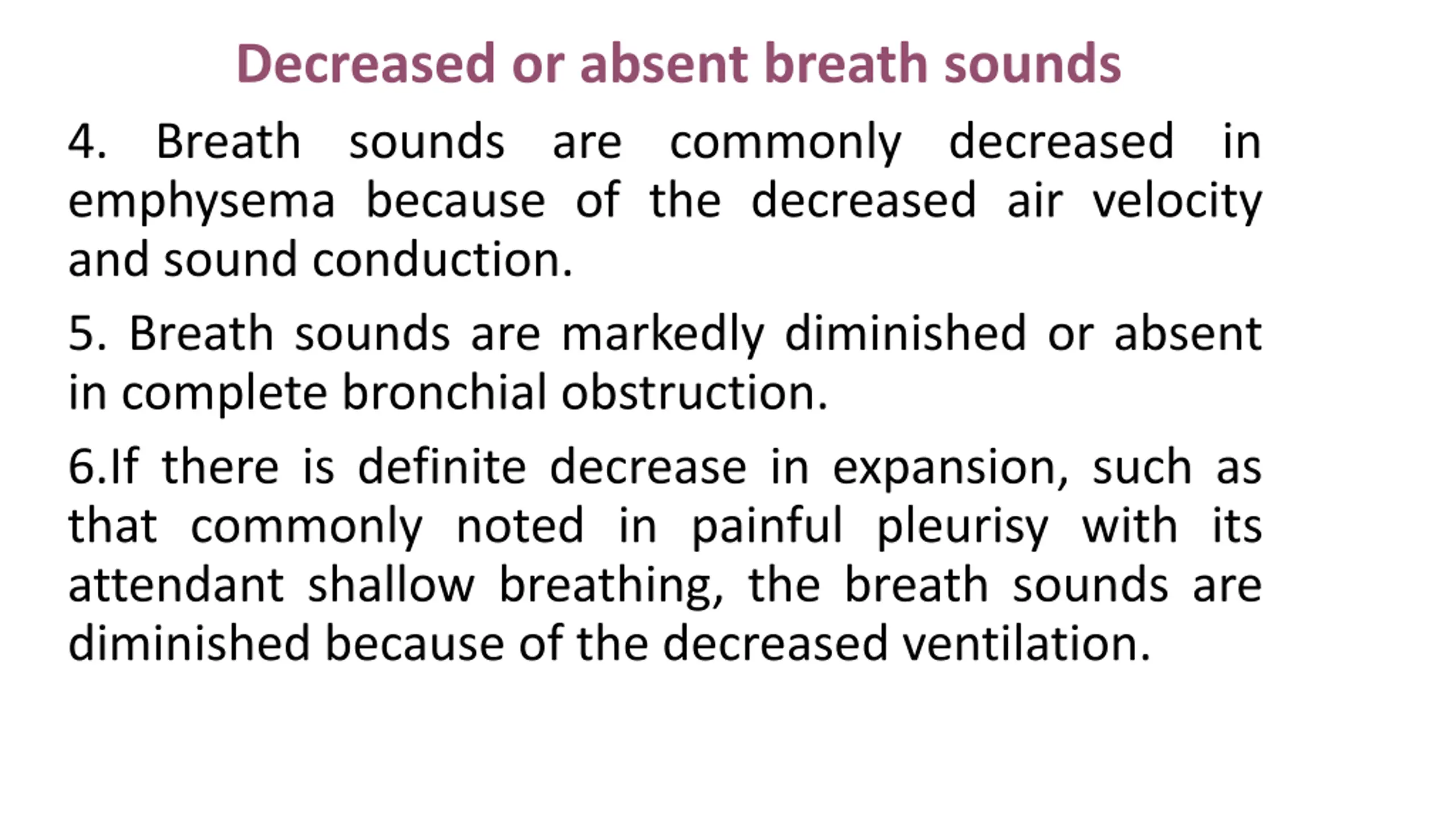 Decreased or absent breath sounds 4. Breath sounds are commonly decreased in emphysema because of the decreased air velocity and sound conduction. 5. Breath sounds are markedly diminished or absent in complete bronchial obstruction. 6.If there is definite decrease in expansion, such as that commonly noted in painful pleurisy with its attendant shallow breathing, the breath sounds are diminished because of the decreased ventilation.