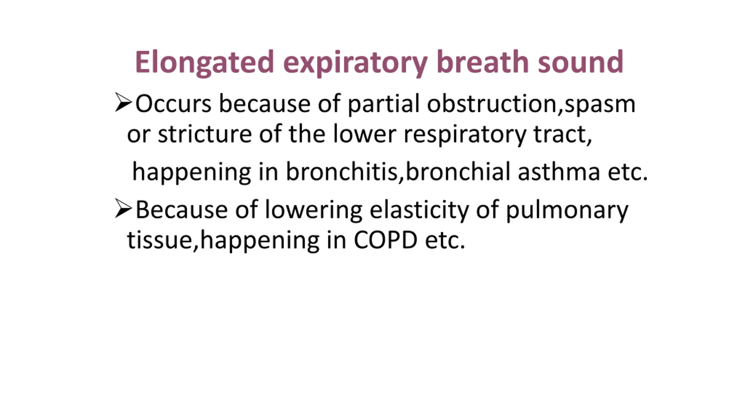 Elongated expiratory breath sound Occurs because of partial obstruction,spasm or stricture of the lower respiratory tract, happening in bronchitis,bronchial asthma etc. Because of lowering elasticity of pulmonary tissue,happening in COPD etc.