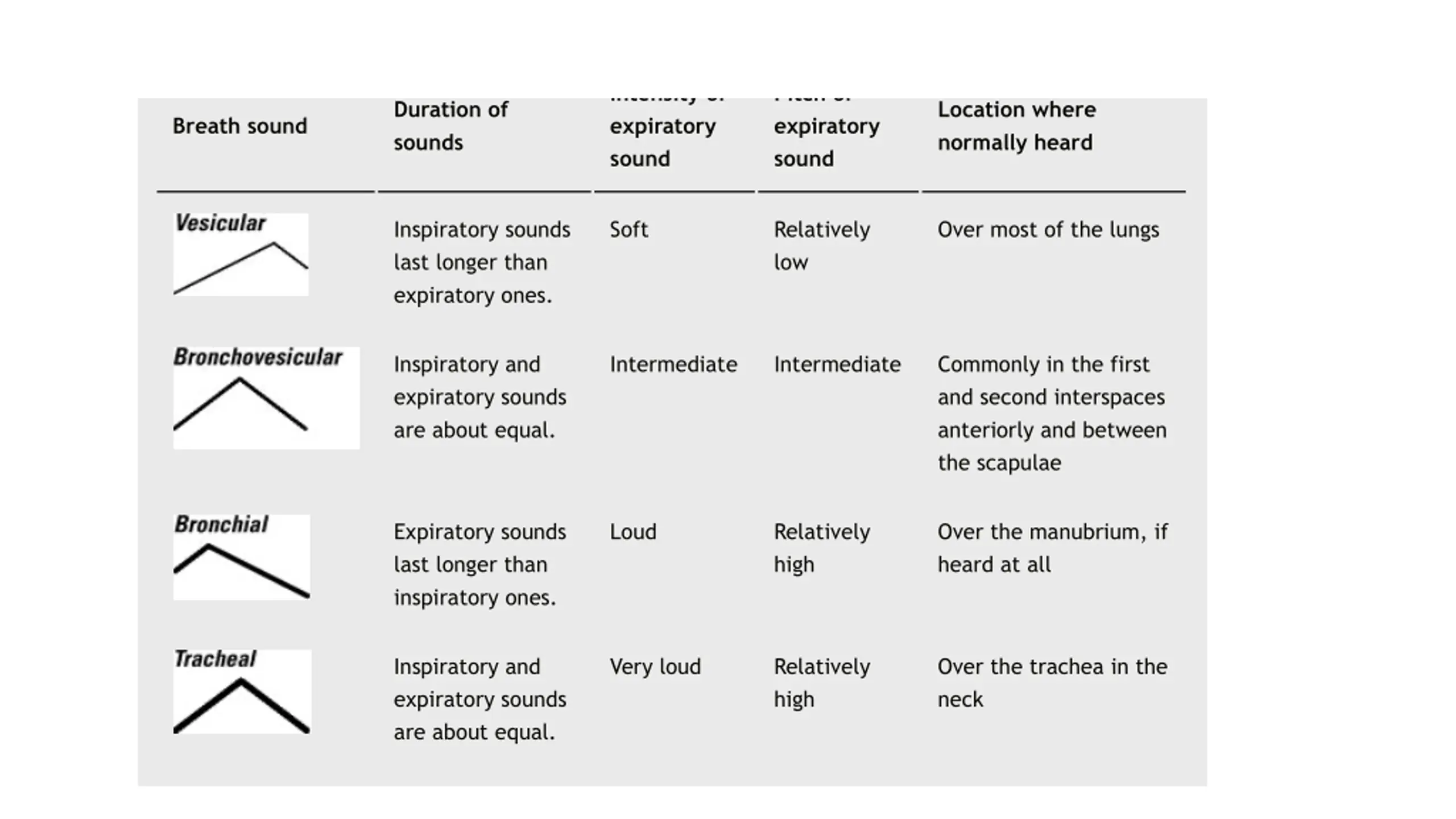 If you hear diminished but normal breath sounds in both lungs, the patient may have emphysema, atelectasis, severe broncho-spasm, or shallow breathing. If you hear breath sounds in one lung only, the patient may have pleural effusion, pneumothorax, a tumor, or mucus plugs in the airways. In such cases, the doctor may order pulmonary function tests to further assess the patient's condition. P (See Interpreting pulmonary function test results, page 40.) Characteristics of breath sounds Use this chart to help you recognize patterns of breath sounds by their intensity, pitch, and duration of inspiratory and expiratory phases. Note that the thickness of the bars indicates intensity; the steeper an incline, the higher the pitch. Intensity of expiratory sound Pitch of expiratory sound Duration of sounds Location where normally heard Breath sound Inspiratory sounds last longer than expiratory ones. Soft Relatively low Over most of the lungs Inspiratory and expiratory sounds are about equal. Intermediate Intermediate Commonly in the first and second interspaces anteriorly and between the scapulae Expiratory sounds last longer than inspiratory ones. Loud Relatively high Over the manubrium, if heard at all Inspiratory and expiratory sounds are about equal. Very loud Relatively high Over the trachea in the neck Sounding board