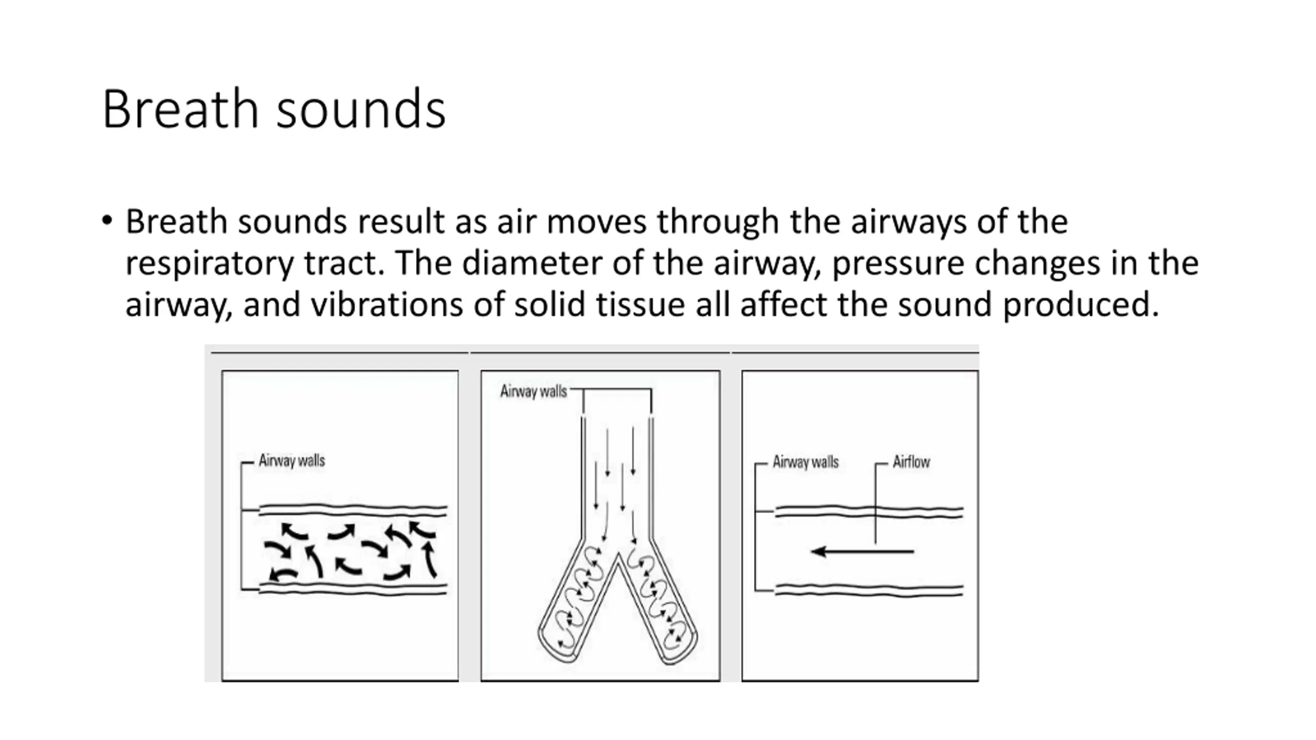 Laminar airflow In the small airways and respiratory bronchioles, airflow is slow and linear. This is called laminar airflow. No abrupt changes in pressure or airway wall movements occur to generate sound. Consequently, air movement in these areas produces no sound. Breath sounds P Comparing airflow patterns The following illustrations show the three primary airflow patterns affecting airway dynamics. Breath sounds result as air moves through the airways of the respiratory tract. The diameter of the airway, pressure changes in the airway, and vibrations of solid tissue all affect the sound produced. Turbulent airflow Circular airflow (vortices) Laminar airflow Understanding sound Mechanical vibrations, sound damping, and impedance matching also affect the sounds heard during auscultation. Mechanical vibrations The mechanical vibrations of solid tissue also produce breath sounds. The speed at which these vibrations travel depends on whether they're traveling through air, fluid, or tissue. The frequency, intensity, and duration of these sounds can be measured. Frequency