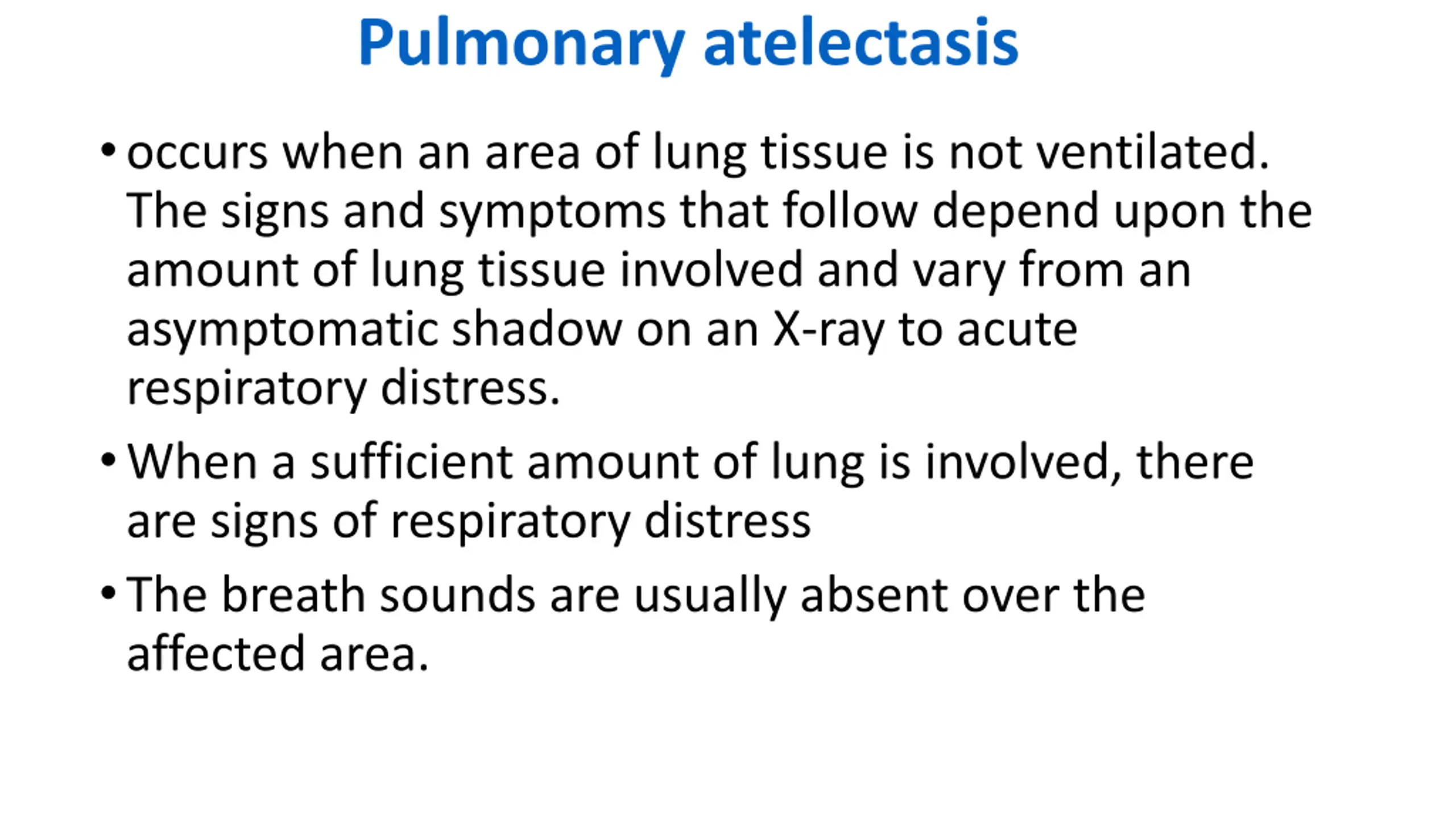Pulmonary atelectasis occurs when an area of lung tissue is not ventilated. The signs and symptoms that follow depend upon the amount of lung tissue involved and vary from an asymptomatic shadow on an X-ray to acute respiratory distress. When a sufficient amount of lung is involved, there are signs of respiratory distress The breath sounds are usually absent over the affected area.
