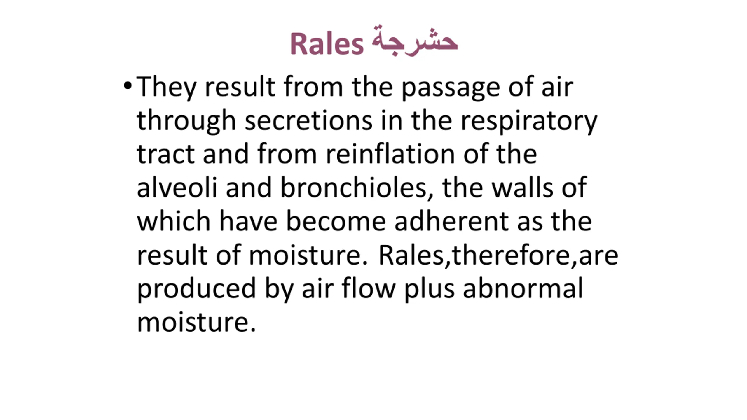 Rales They result from the passage of air through secretions in the respiratory tract and from reinflation of the alveoli and bronchioles, the walls of which have become adherent as the result of moisture. Rales,therefore,are produced by air flow plus abnormal moisture.