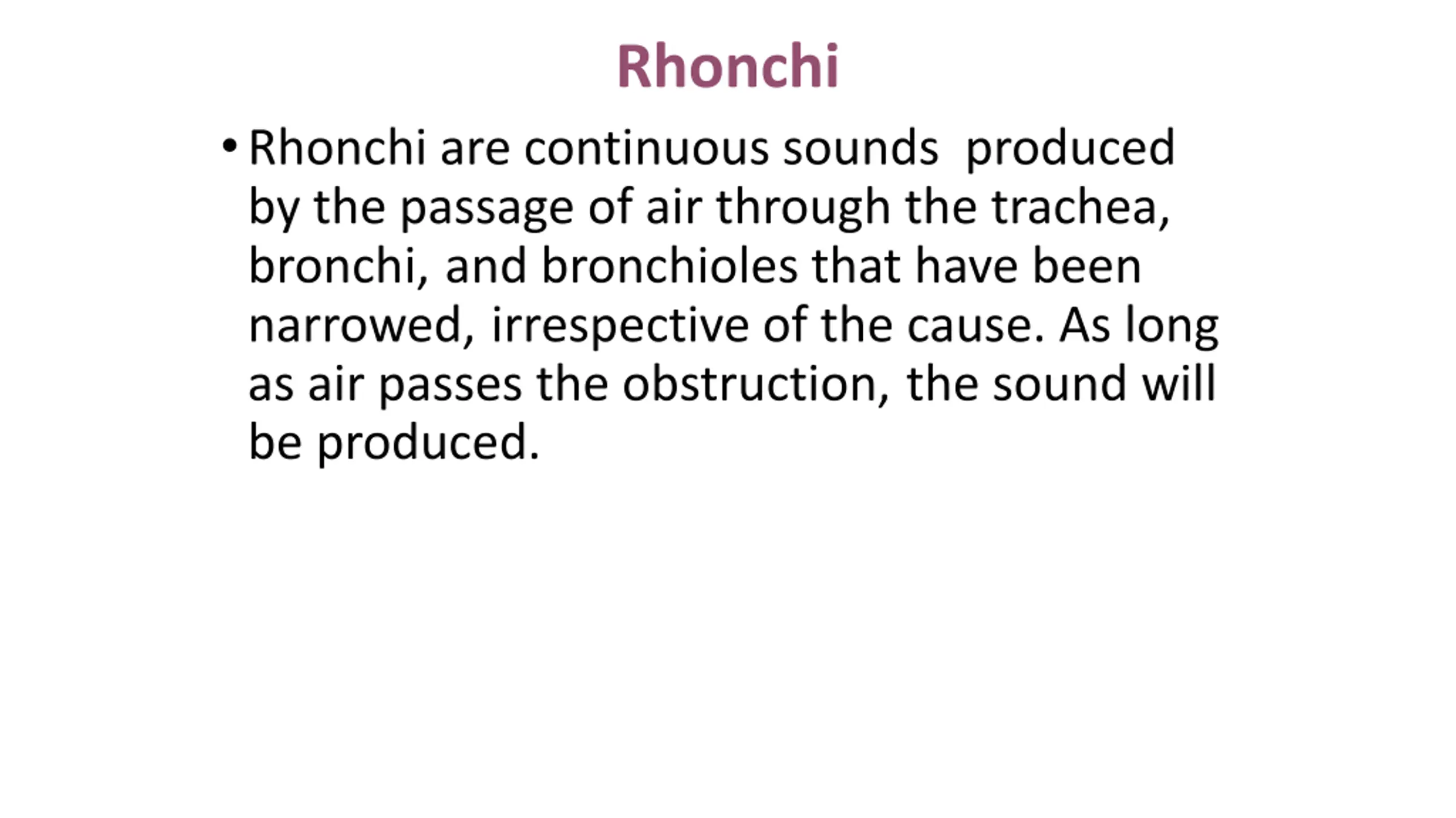 Rhonchi Rhonchi are continuous sounds produced by the passage of air through the trachea, bronchi, and bronchioles that have been narrowed, irrespective of the cause. As long as air passes the obstruction, the sound will be produced.