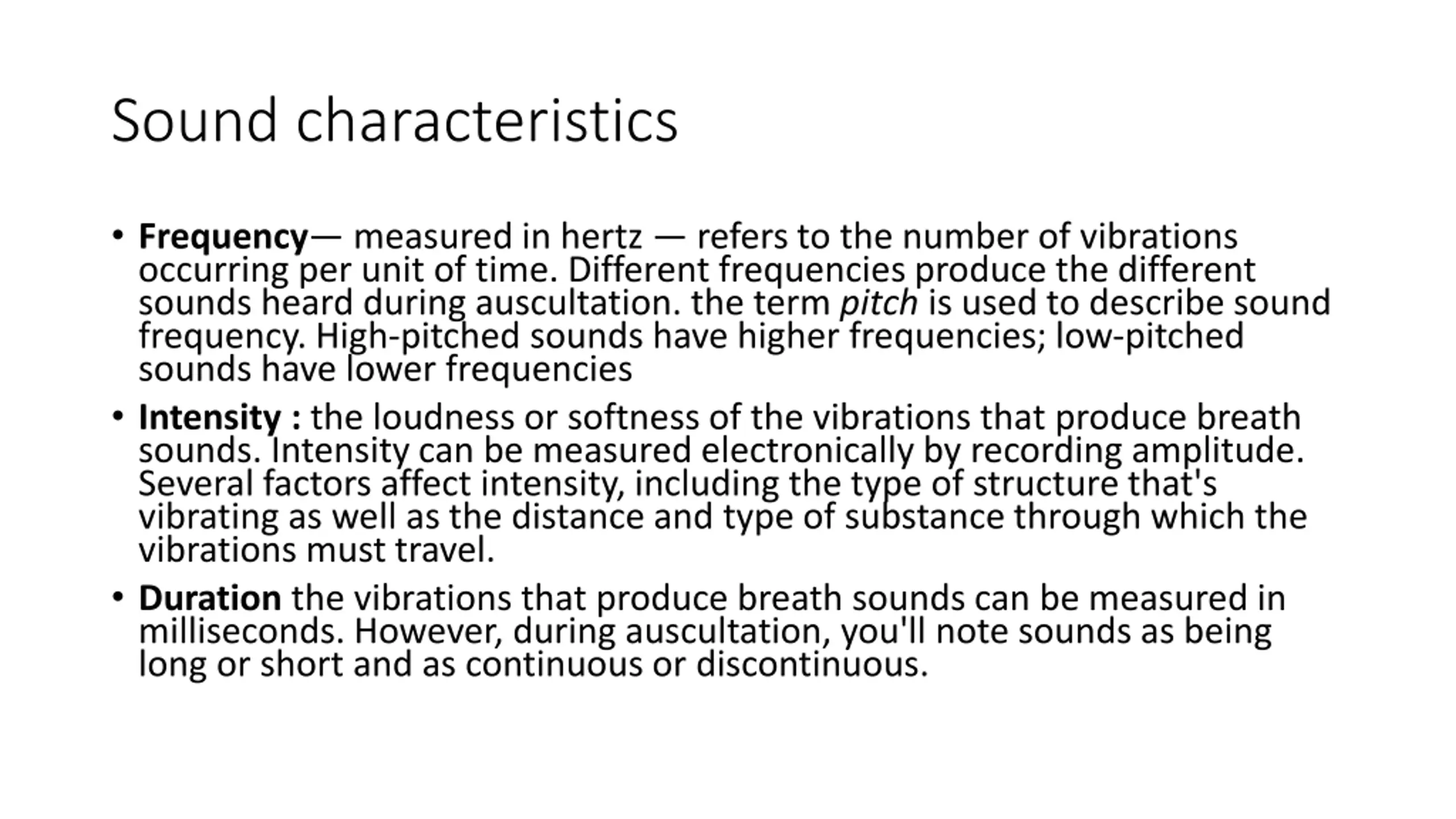 Sound characteristics Frequency measured in hertz refers to the number of vibrations occurring per unit of time. Different frequencies produce the different sounds heard during auscultation. the term pitch is used to describe sound frequency. High-pitched sounds have higher frequencies; low-pitched sounds have lower frequencies Intensity : the loudness or softness of the vibrations that produce breath sounds. Intensity can be measured electronically by recording amplitude. Several factors affect intensity, including the type of structure that's vibrating as well as the distance and type of substance through which the vibrations must travel. Duration the vibrations that produce breath sounds can be measured in milliseconds. However, during auscultation, you'll note sounds as being long or short and as continuous or discontinuous.
