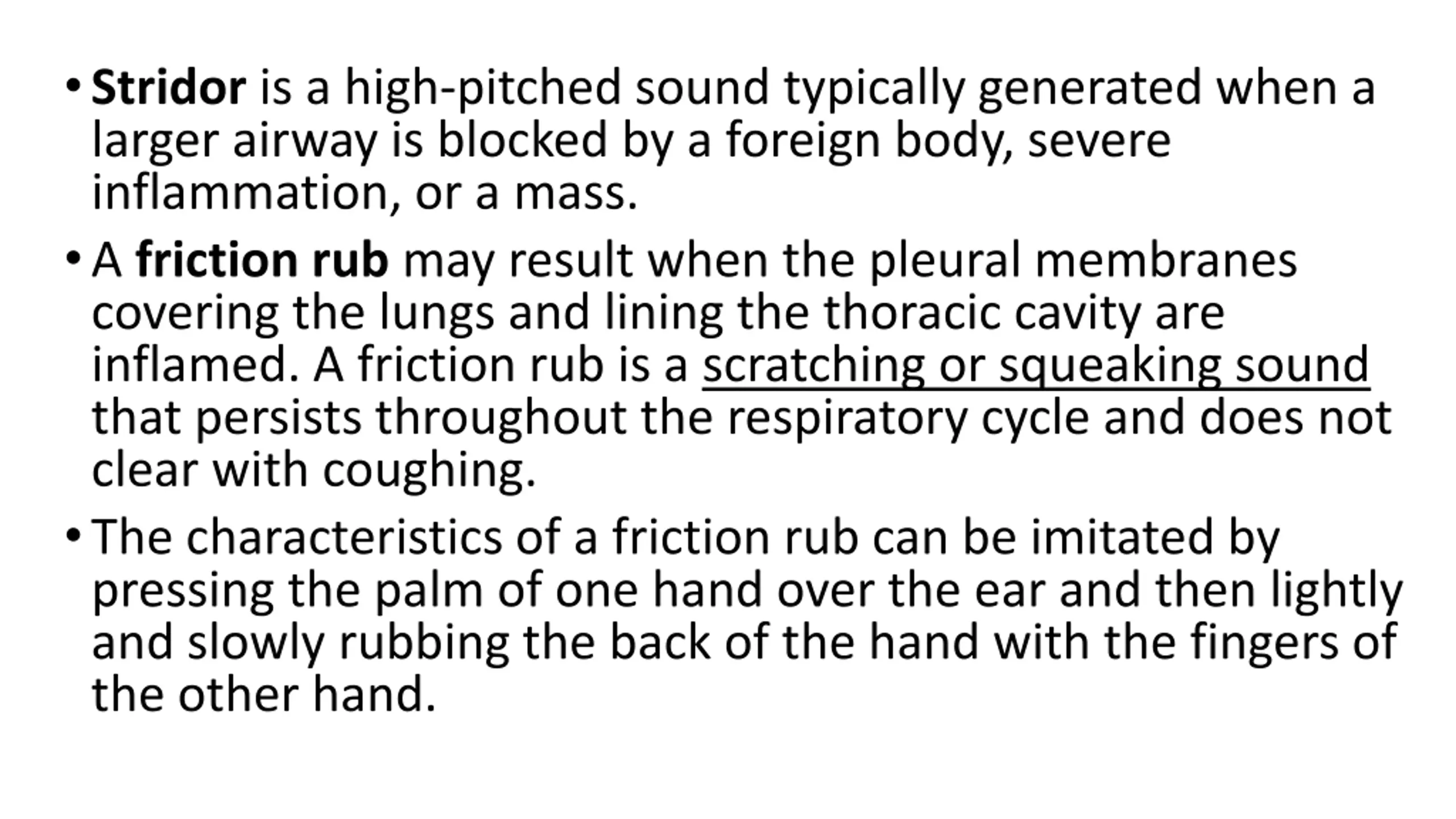 Stridor is a high-pitched sound typically generated when a larger airway is blocked by a foreign body, severe inflammation, or a mass. A friction rub may result when the pleural membranes covering the lungs and lining the thoracic cavity are inflamed. A friction rub is a scratching or squeaking sound that persists throughout the respiratory cycle and does not clear with coughing. The characteristics of a friction rub can be imitated by pressing the palm of one hand over the ear and then lightly and slowly rubbing the back of the hand with the fingers of the other hand.
