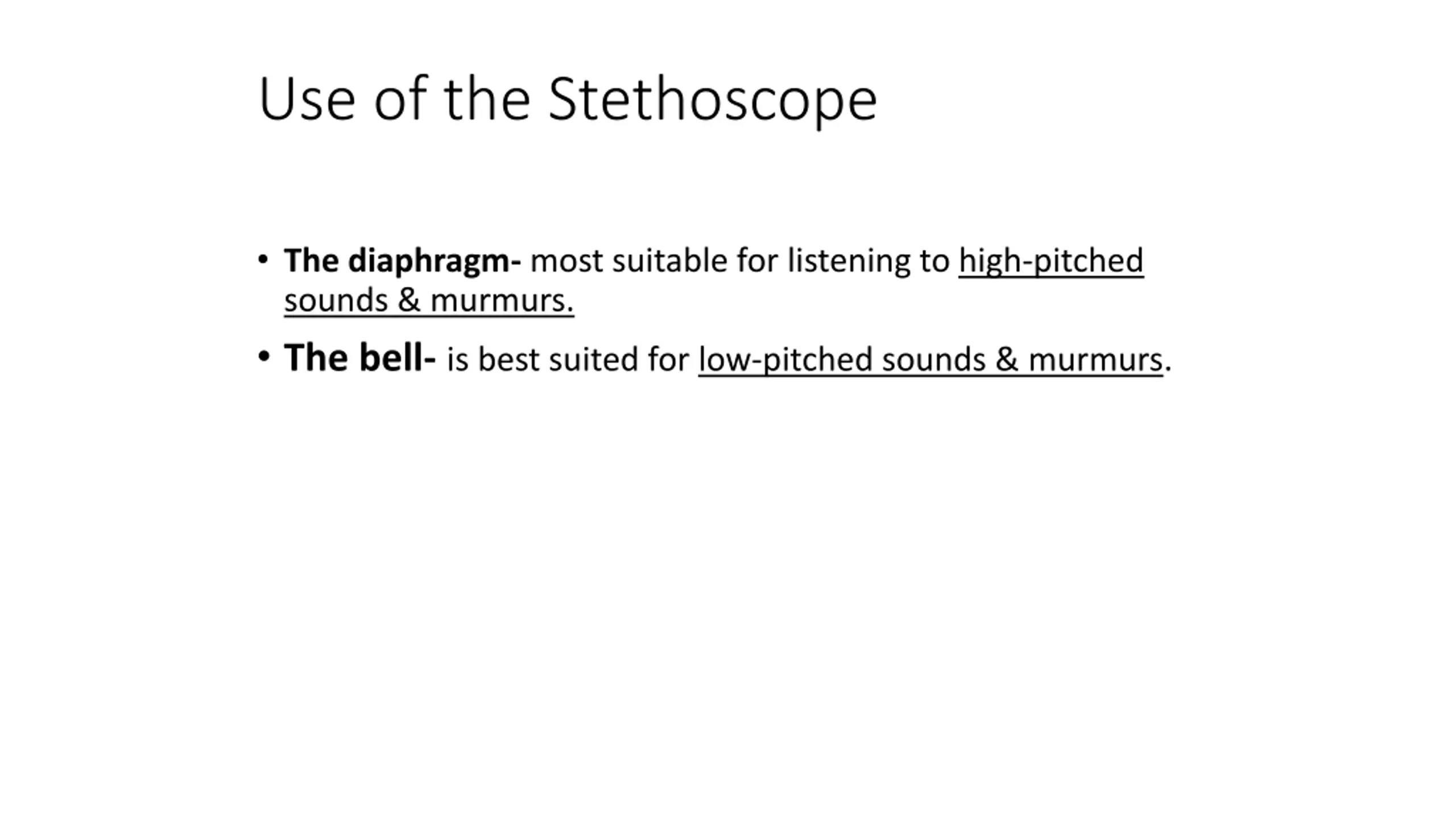 Use of the Stethoscope The diaphragm- most suitable for listening to high-pitched sounds & murmurs. The bell- is best suited for low-pitched sounds & murmurs.