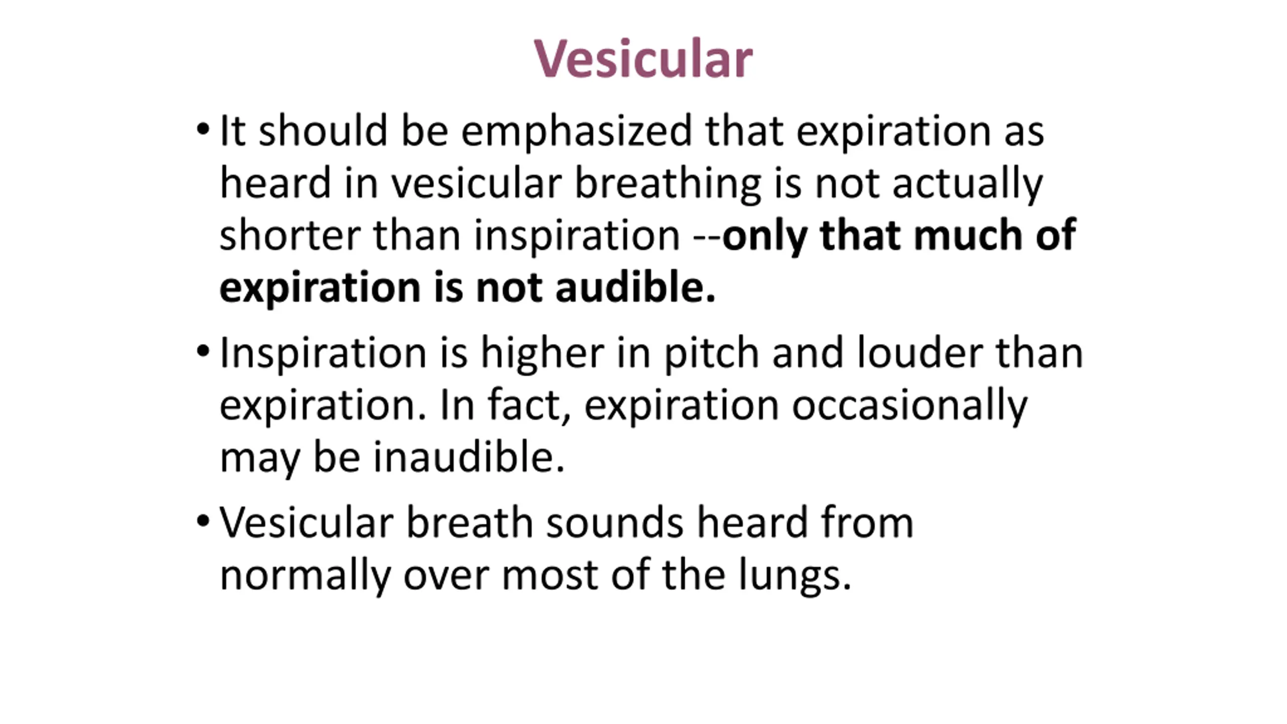 Vesicular It should be emphasized that expiration as heard in vesicular breathing is not actually shorter than inspiration --only that much of expiration is not audible. Inspiration is higher in pitch and louder than expiration. In fact, expiration occasionally may be inaudible. Vesicular breath sounds heard from normally over most of the lungs.