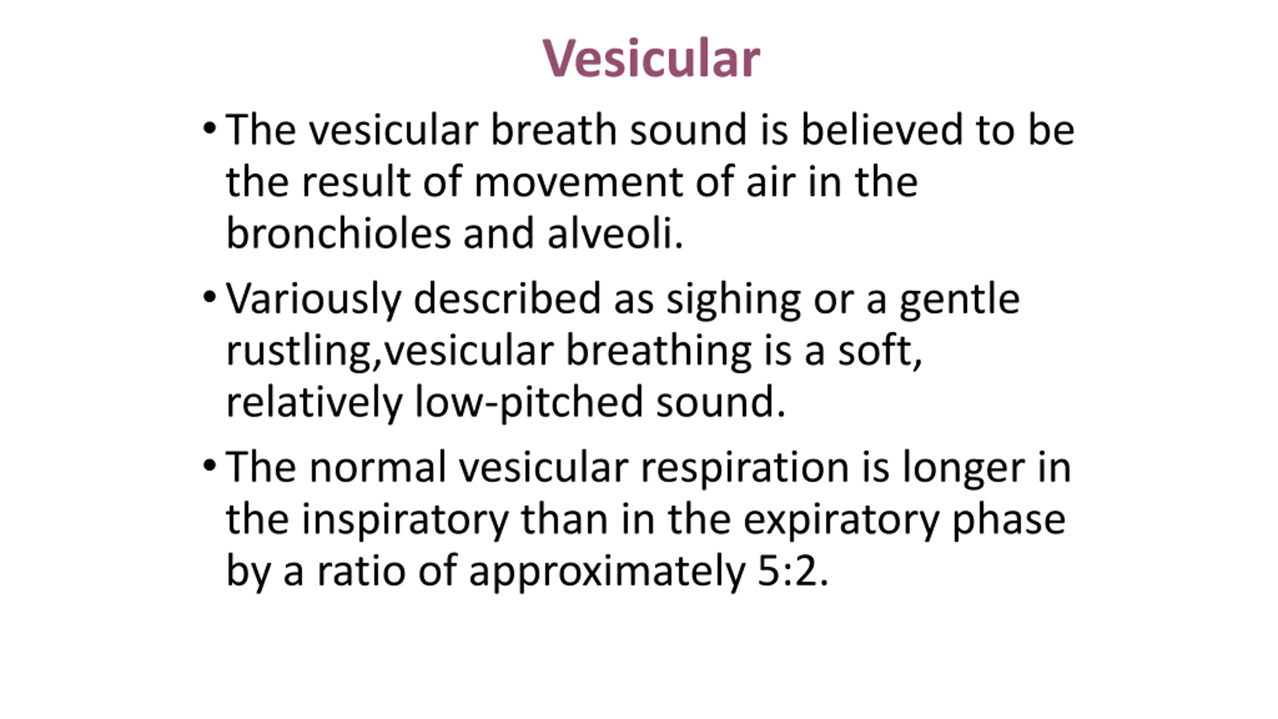 Vesicular The vesicular breath sound is believed to be the result of movement of air in the bronchioles and alveoli. Variously described as sighing or a gentle rustling,vesicular breathing is a soft, relatively low-pitched sound. The normal vesicular respiration is longer in the inspiratory than in the expiratory phase by a ratio of approximately 5:2.