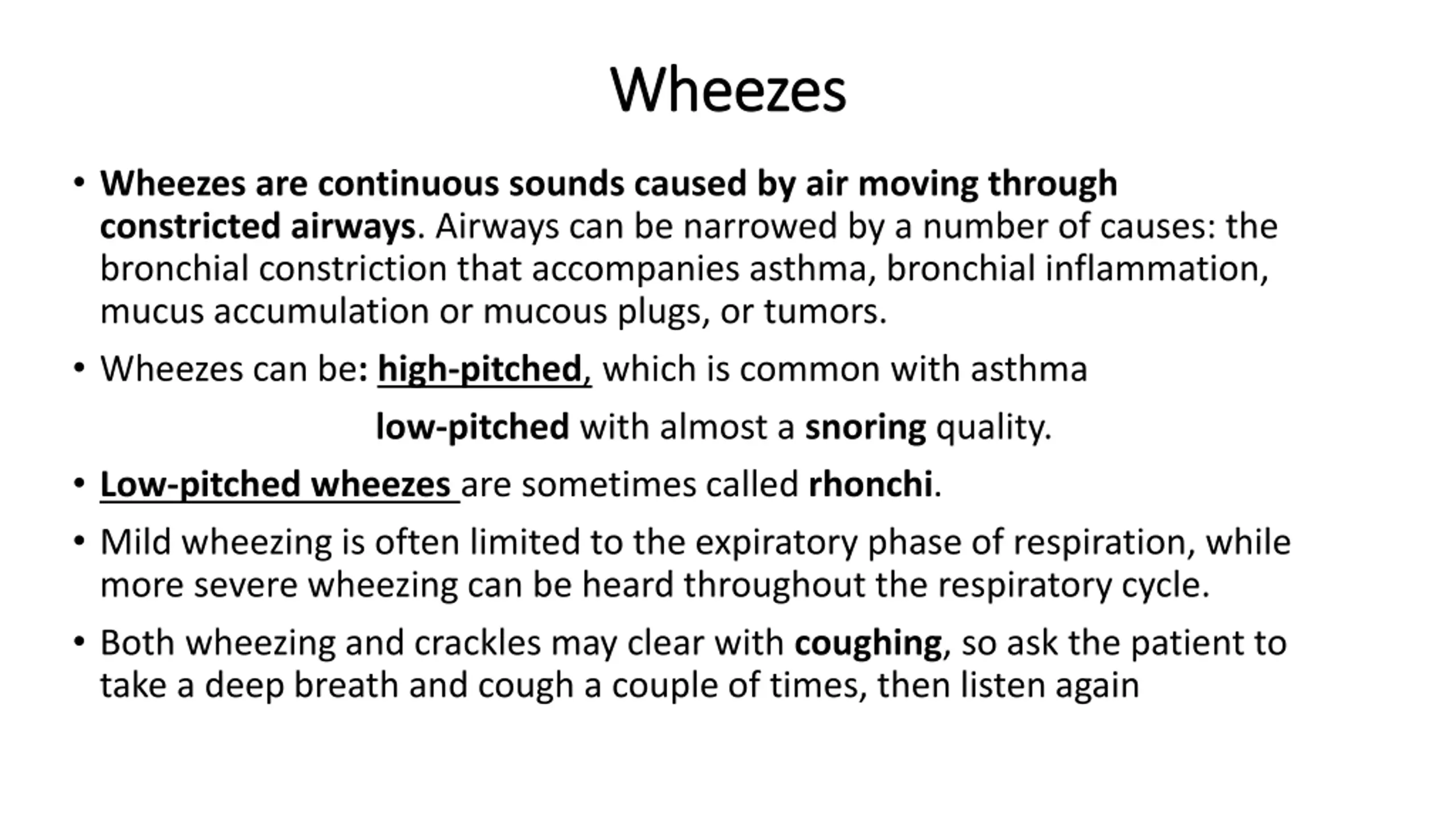 Wheezes Wheezes Wheezes are continuous sounds caused by air moving through constricted airways. Airways can be narrowed by a number of causes: the bronchial constriction that accompanies asthma, bronchial inflammation, mucus accumulation or mucous plugs, or tumors. Wheezes can be: high-pitched, which is common with asthma low-pitched with almost a snoring quality. Low-pitched wheezes are sometimes called rhonchi. Mild wheezing is often limited to the expiratory phase of respiration, while more severe wheezing can be heard throughout the respiratory cycle. Both wheezing and crackles may clear with coughing, so ask the patient to take a deep breath and cough a couple of times, then listen again