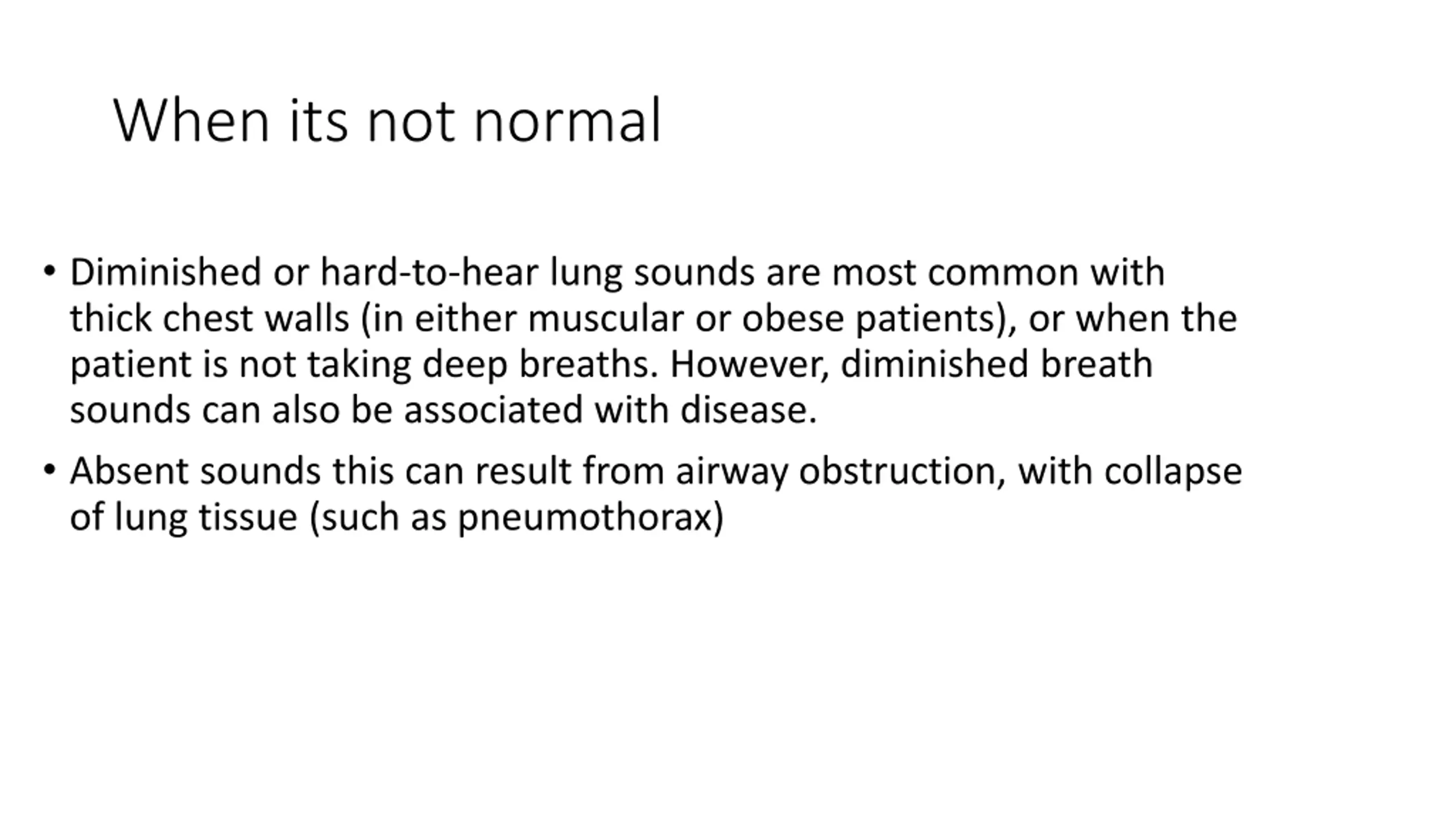 When its not normal Diminished or hard-to-hear lung sounds are most common with thick chest walls (in either muscular or obese patients), or when the patient is not taking deep breaths. However, diminished breath sounds can also be associated with disease. Absent sounds this can result from airway obstruction, with collapse of lung tissue (such as pneumothorax)