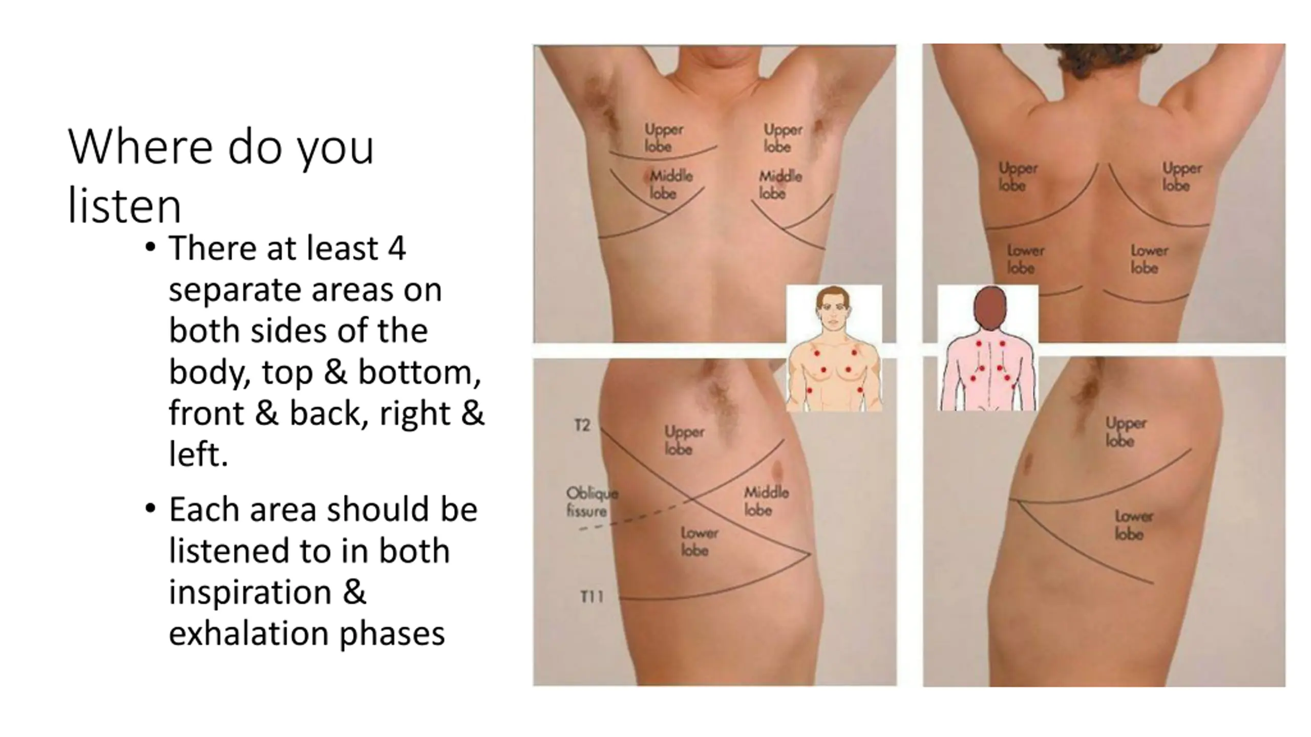 Where do you listen There at least 4 separate areas on both sides of the body, top & bottom, front & back, right & left. Each area should be listened to in both inspiration & exhalation phases