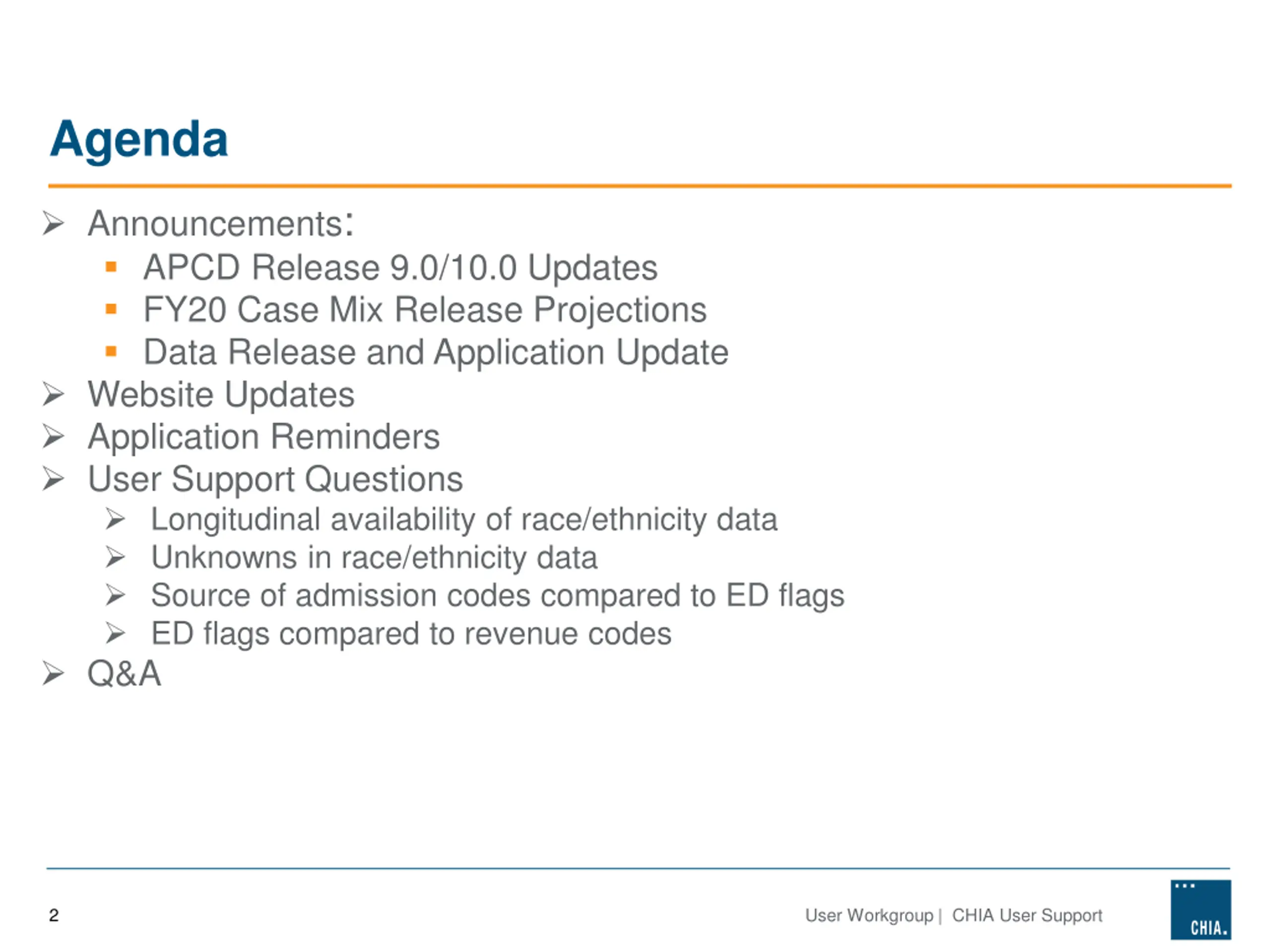 Agenda Announcements: APCD Release 9.0/10.0 Updates FY20 Case Mix Release Projections Data Release and Application Update Website Updates Application Reminders User Support Questions Longitudinal availability of race/ethnicity data Unknowns in race/ethnicity data Source of admission codes compared to ED flags ED flags compared to revenue codes Q&A 2 User Workgroup | CHIA User Support