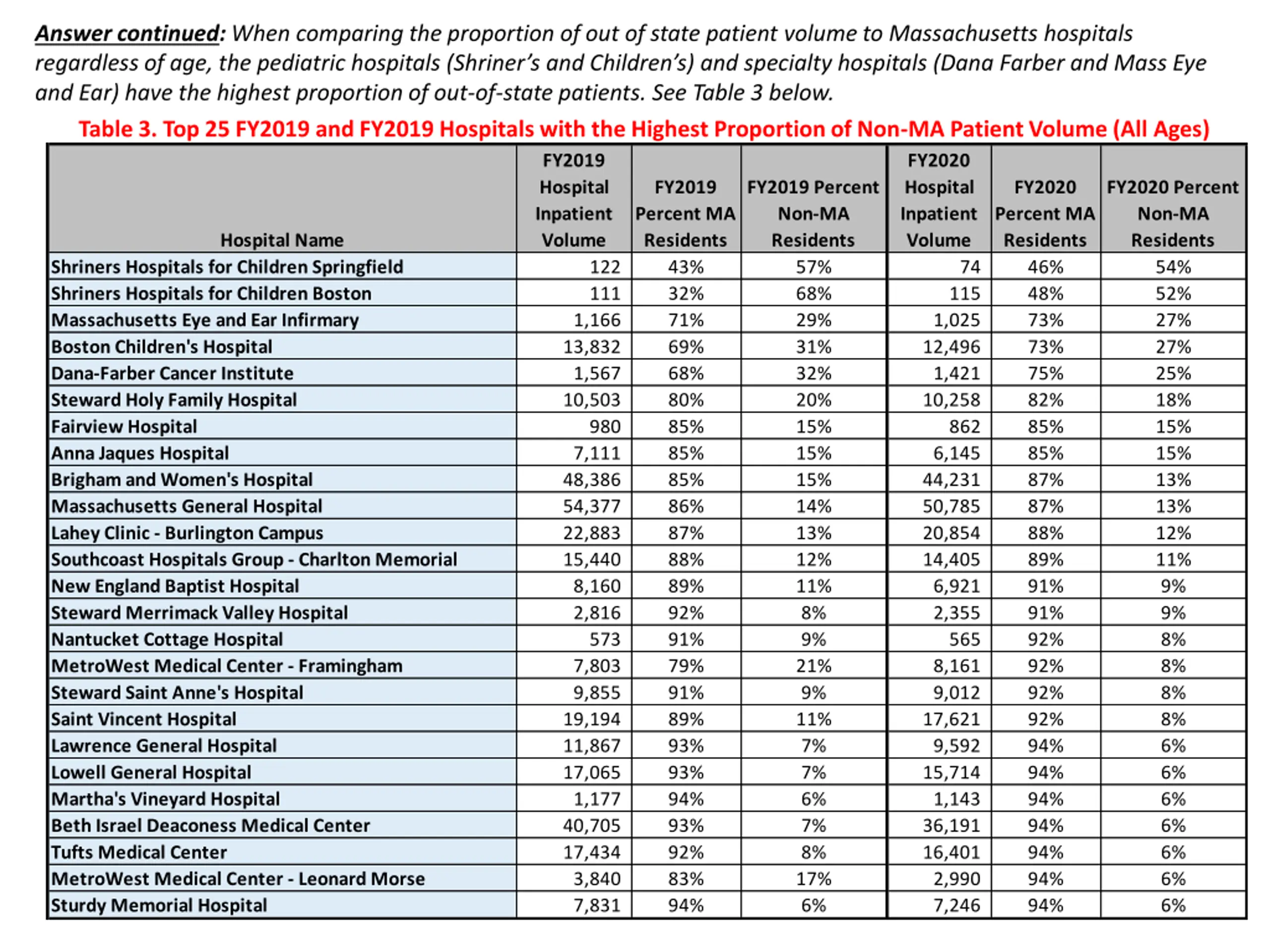 Answer continued: When comparing the proportion of out of state patient volume to Massachusetts hospitals regardless of age, the pediatric hospitals (Shriner s and Children s) and specialty hospitals (Dana Farber and Mass Eye and Ear) have the highest proportion of out-of-state patients. See Table 3 below. Table 3. Top 25 FY2019 and FY2019 Hospitals with the Highest Proportion of Non-MA Patient Volume (All Ages) FY2019 Hospital Inpatient Volume 13,832 1,567 10,503 7,111 48,386 54,377 22,883 15,440 8,160 2,816 7,803 9,855 19,194 11,867 17,065 1,177 40,705 17,434 3,840 7,831 FY2020 Hospital Inpatient Volume 1,025 12,496 1,421 10,258 6,145 44,231 50,785 20,854 14,405 6,921 2,355 8,161 9,012 17,621 9,592 15,714 1,143 36,191 16,401 2,990 7,246 FY2019 Percent MA Residents 43% 32% 71% 69% 68% 80% 85% 85% 85% 86% 87% 88% 89% 92% 91% 79% 91% 89% 93% 93% 94% 93% 92% 83% 94% FY2019 Percent Non-MA Residents 57% 68% 29% 31% 32% 20% 15% 15% 15% 14% 13% 12% 11% 8% 9% 21% 9% 11% 7% 7% 6% 7% 8% 17% 6% FY2020 Percent MA Residents 46% 48% 73% 73% 75% 82% 85% 85% 87% 87% 88% 89% 91% 91% 92% 92% 92% 92% 94% 94% 94% 94% 94% 94% 94% FY2020 Percent Non-MA Residents 54% 52% 27% 27% 25% 18% 15% 15% 13% 13% 12% 11% 9% 9% 8% 8% 8% 8% 6% 6% 6% 6% 6% 6% 6% Hospital Name Shriners Hospitals for Children Springfield Shriners Hospitals for Children Boston Massachusetts Eye and Ear Infirmary Boston Children's Hospital Dana-Farber Cancer Institute Steward Holy Family Hospital Fairview Hospital Anna Jaques Hospital Brigham and Women's Hospital Massachusetts General Hospital Lahey Clinic - Burlington Campus Southcoast Hospitals Group - Charlton Memorial New England Baptist Hospital Steward Merrimack Valley Hospital Nantucket Cottage Hospital MetroWest Medical Center - Framingham Steward Saint Anne's Hospital Saint Vincent Hospital Lawrence General Hospital Lowell General Hospital Martha's Vineyard Hospital Beth Israel Deaconess Medical Center Tufts Medical Center MetroWest Medical Center - Leonard Morse Sturdy Memorial Hospital 122 111 74 115 1,166 980 862 573 565