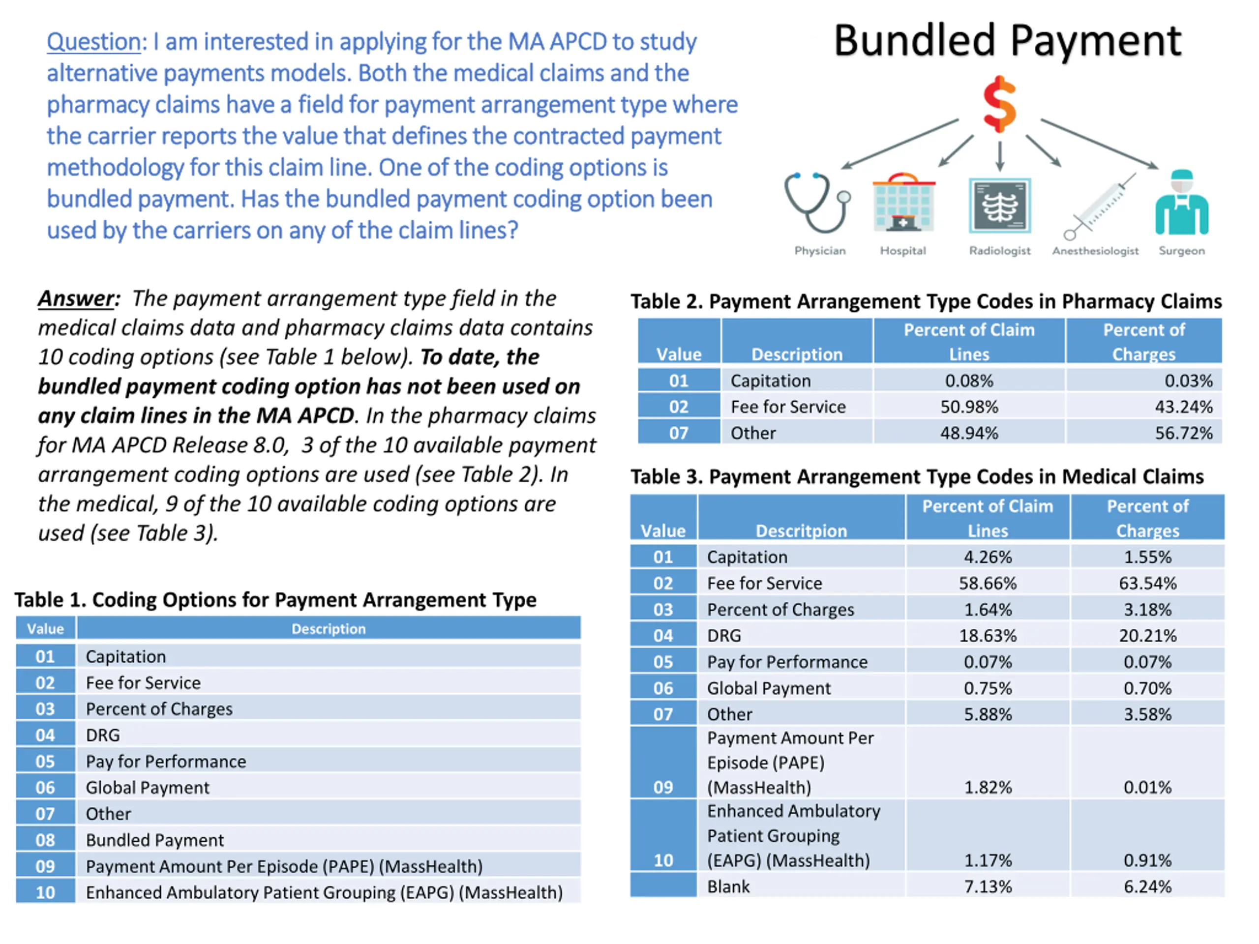 Bun Bundled Payment Question Question: I am interested in applying for the MA APCD to study : I am interested in applying for the MA APCD to study alternative payments models. Both the medical claims and the alternative payments models. Both the medical claims and the pharmacy claims have a field for payment arrangement type where pharmacy claims have a field for payment arrangement type where the carrier reports the value that defines the contracted payment the carrier reports the value that defines the contracted payment methodology for this claim line. One of the coding options is methodology for this claim line. One of the coding options is bundled payment. Has the bundled payment coding option been bundled payment. Has the bundled payment coding option been used by the carriers on any of the claim lines? used by the carriers on any of the claim lines? Answer: The payment arrangement type field in the medical claims data and pharmacy claims data contains 10 coding options (see Table 1 below). To date, the bundled payment coding option has not been used on any claim lines in the MA APCD. In the pharmacy claims for MA APCD Release 8.0, 3 of the 10 available payment arrangement coding options are used (see Table 2). In the medical, 9 of the 10 available coding options are used (see Table 3). Table 2. Payment Arrangement Type Codes in Pharmacy Claims Percent of Claim Lines 0.08% 50.98% 48.94% Percent of Charges Value 01 02 07 Description Capitation Fee for Service Other 0.03% 43.24% 56.72% Table 3. Payment Arrangement Type Codes in Medical Claims Percent of Claim Lines 4.26% 58.66% 1.64% 18.63% 0.07% 0.75% 5.88% Percent of Charges 1.55% 63.54% 3.18% 20.21% 0.07% 0.70% 3.58% Value 01 02 03 04 05 06 07 Descritpion Capitation Fee for Service Percent of Charges DRG Pay for Performance Global Payment Other Payment Amount Per Episode (PAPE) (MassHealth) Enhanced Ambulatory Patient Grouping (EAPG) (MassHealth) Blank Table 1. Coding Options for Payment Arrangement Type Value Description 01 02 03 04 05 06 07 08 09 10 Capitation Fee for Service Percent of Charges DRG Pay for Performance Global Payment Other Bundled Payment Payment Amount Per Episode (PAPE) (MassHealth) Enhanced Ambulatory Patient Grouping (EAPG) (MassHealth) 09 1.82% 0.01% 10 1.17% 7.13% 0.91% 6.24%