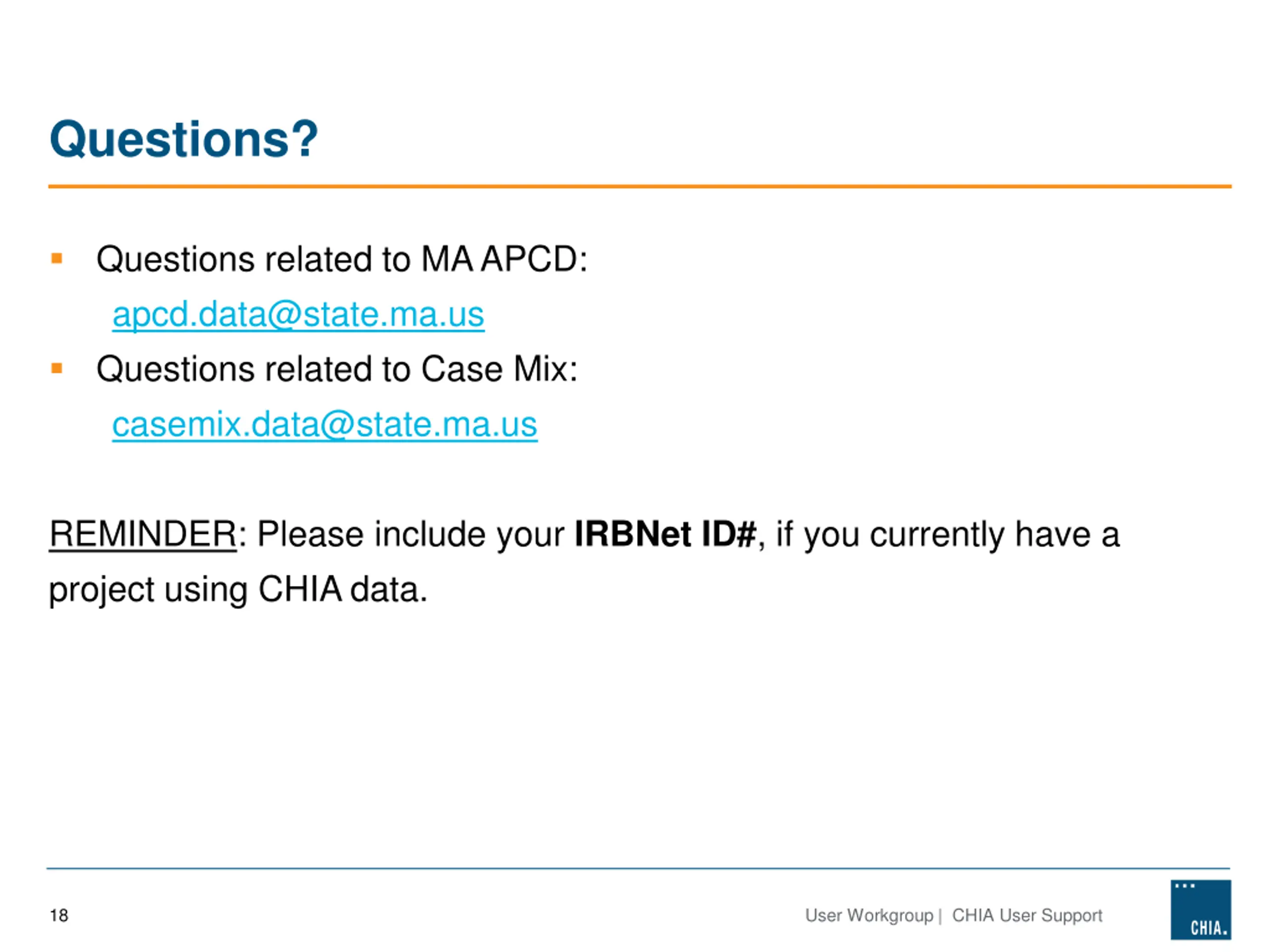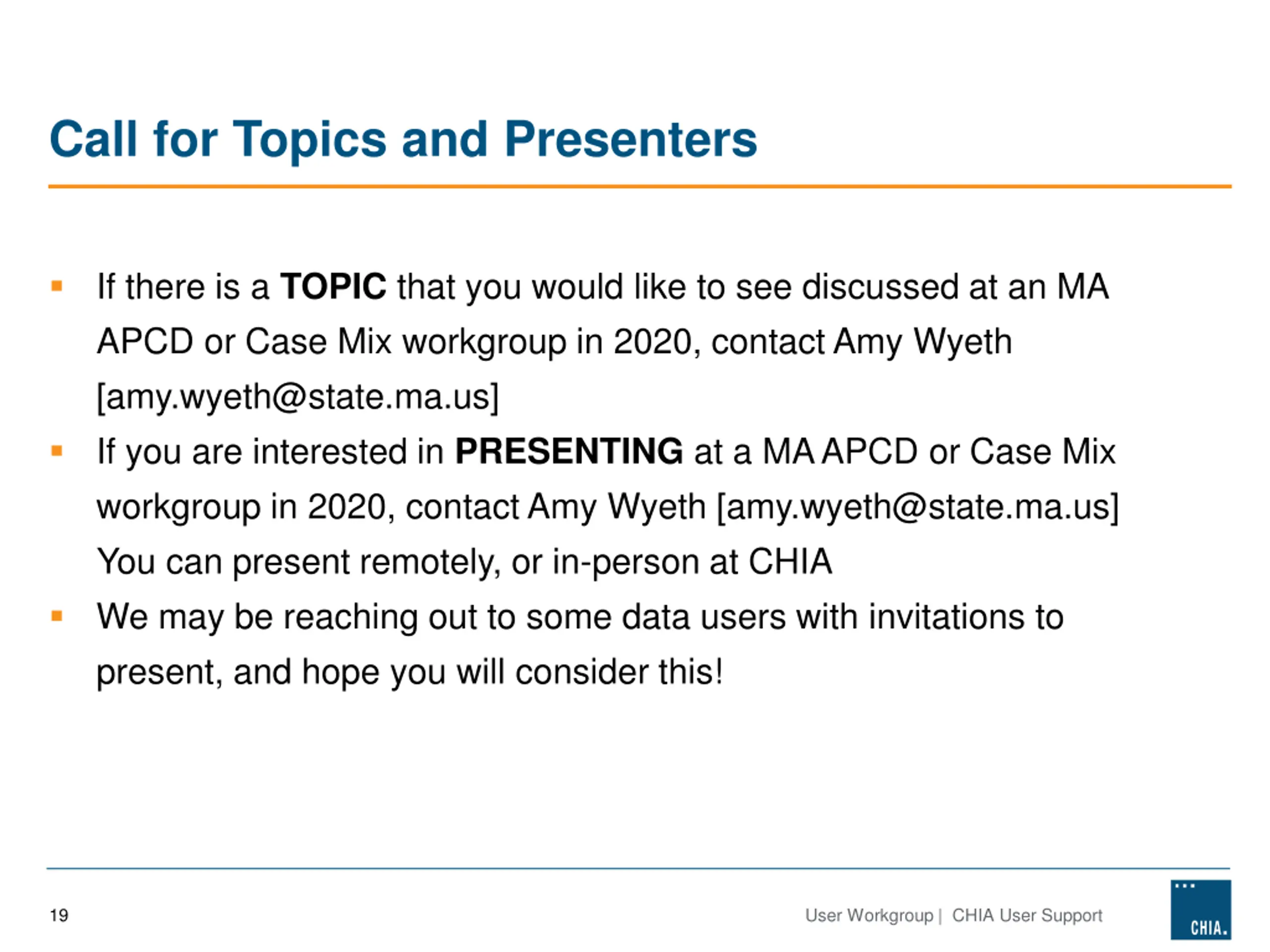 Questions? Questions related to MA APCD: apcd.data@state.ma.us Questions related to Case Mix: casemix.data@state.ma.us REMINDER: Please include your IRBNet ID#, if you currently have a project using CHIA data. 18 User Workgroup | CHIA User Support