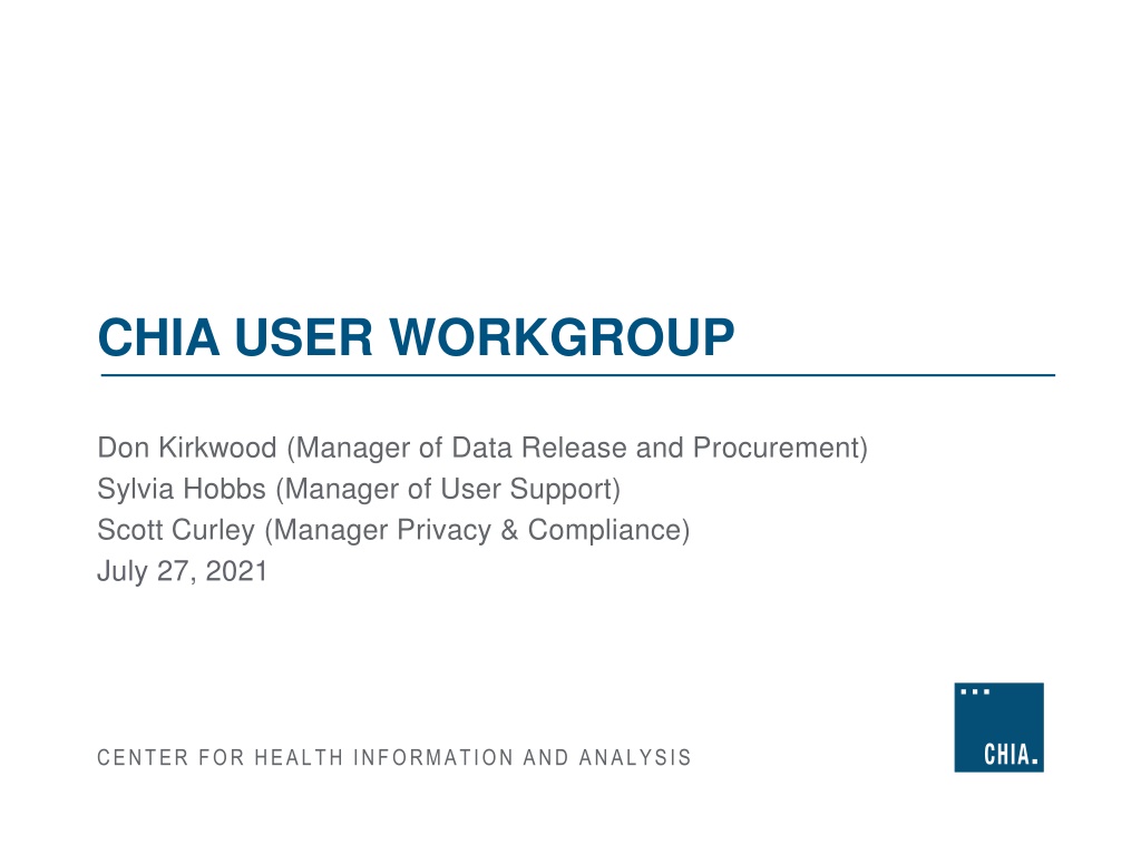 CHIA USER WORKGROUP Don Kirkwood (Manager of Data Release and Procurement) Sylvia Hobbs (Manager of User Support) Scott Curley (Manager Privacy & Compliance) July 27, 2021 CENTER FOR HEALTH INFORMATION AND ANALYSIS