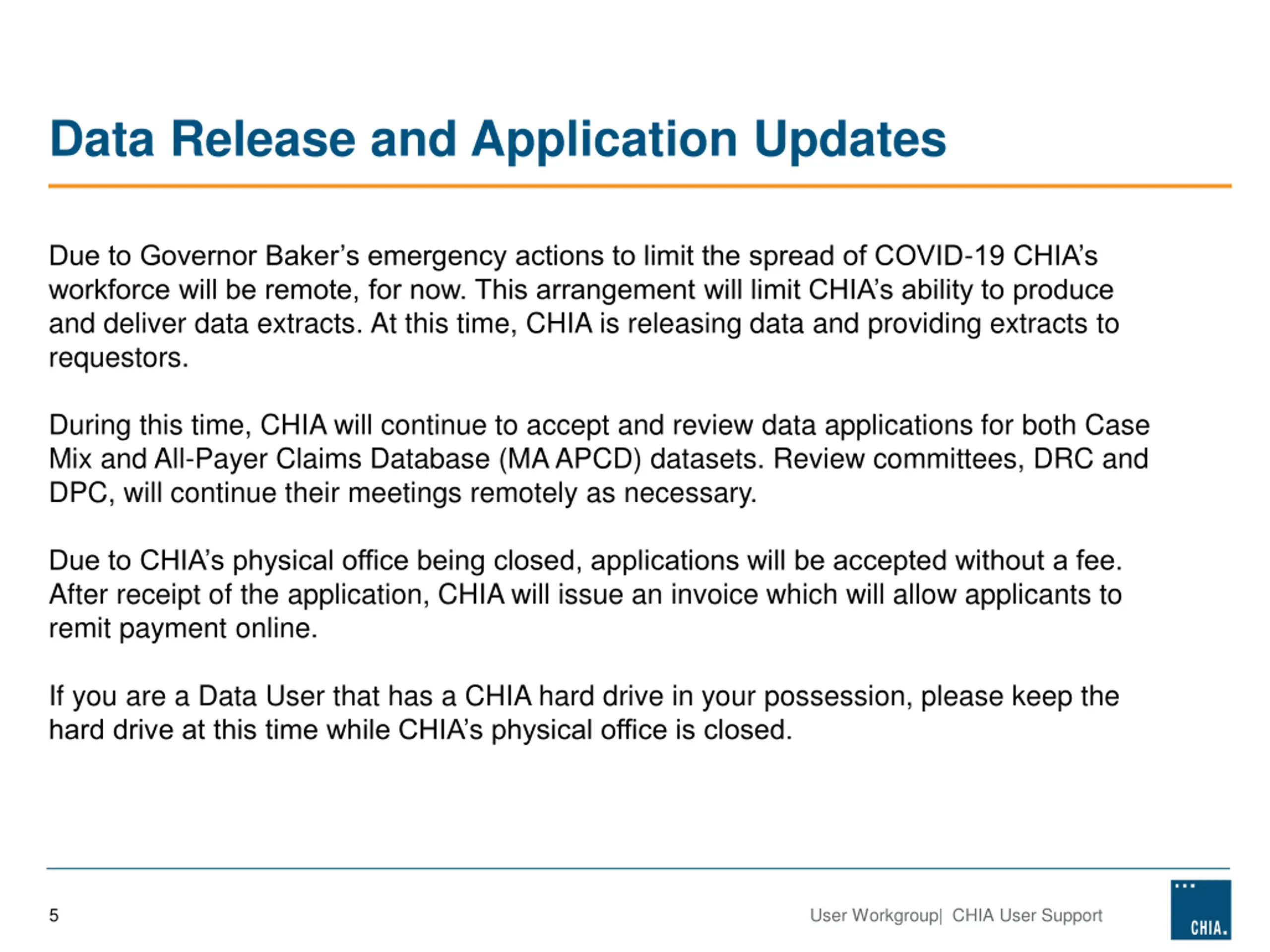 Data Release and Application Updates Due to Governor Baker s emergency actions to limit the spread of COVID-19 CHIA s workforce will be remote, for now. This arrangement will limit CHIA s ability to produce and deliver data extracts. At this time, CHIA is releasing data and providing extracts to requestors. During this time, CHIA will continue to accept and review data applications for both Case Mix and All-Payer Claims Database (MA APCD) datasets. Review committees, DRC and DPC, will continue their meetings remotely as necessary. Due to CHIA s physical office being closed, applications will be accepted without a fee. After receipt of the application, CHIA will issue an invoice which will allow applicants to remit payment online. If you are a Data User that has a CHIA hard drive in your possession, please keep the hard drive at this time while CHIA s physical office is closed. 5 User Workgroup| CHIA User Support