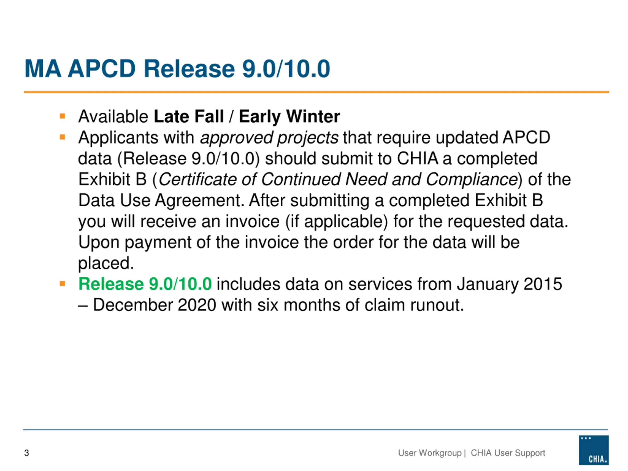 MA APCD Release 9.0/10.0 Available Late Fall / Early Winter Applicants with approved projects that require updated APCD data (Release 9.0/10.0) should submit to CHIA a completed Exhibit B (Certificate of Continued Need and Compliance) of the Data Use Agreement. After submitting a completed Exhibit B you will receive an invoice (if applicable) for the requested data. Upon payment of the invoice the order for the data will be placed. Release 9.0/10.0 includes data on services from January 2015 December 2020 with six months of claim runout. 3 User Workgroup | CHIA User Support