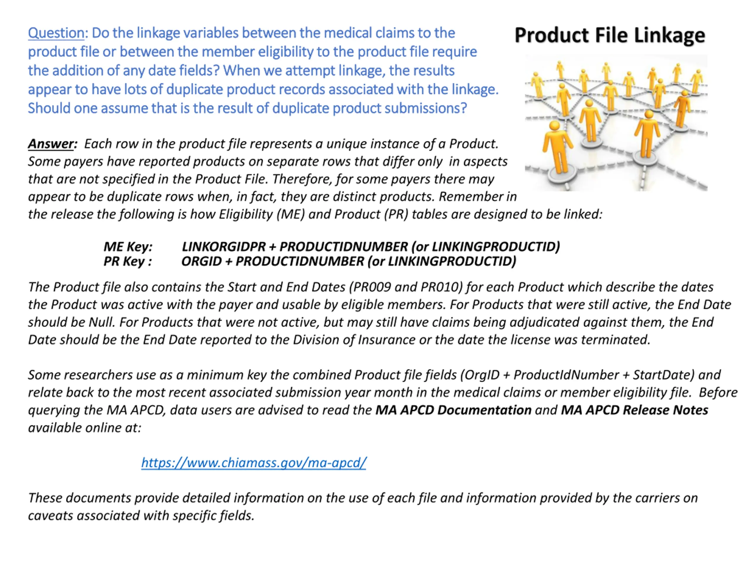 Question Question: Do the linkage variables between the medical claims to the : Do the linkage variables between the medical claims to the product file or between the member eligibility to the product file require product file or between the member eligibility to the product file require the addition of any date fields? When we attempt linkage, the results the addition of any date fields? When we attempt linkage, the results appear to have lots of duplicate product records associated with the linkage. appear to have lots of duplicate product records associated with the linkage. Should one assume that is the result of duplicate product submissions? Should one assume that is the result of duplicate product submissions? Answer: Each row in the product file represents a unique instance of a Product. Some payers have reported products on separate rows that differ only in aspects that are not specified in the Product File. Therefore, for some payers there may appear to be duplicate rows when, in fact, they are distinct products. Remember in the release the following is how Eligibility (ME) and Product (PR) tables are designed to be linked: ME Key: PR Key : LINKORGIDPR + PRODUCTIDNUMBER (or LINKINGPRODUCTID) ORGID + PRODUCTIDNUMBER (or LINKINGPRODUCTID) The Product file also contains the Start and End Dates (PR009 and PR010) for each Product which describe the dates the Product was active with the payer and usable by eligible members. For Products that were still active, the End Date should be Null. For Products that were not active, but may still have claims being adjudicated against them, the End Date should be the End Date reported to the Division of Insurance or the date the license was terminated. Some researchers use as a minimum key the combined Product file fields (OrgID + ProductIdNumber + StartDate) and relate back to the most recent associated submission year month in the medical claims or member eligibility file. Before querying the MA APCD, data users are advised to read the MA APCD Documentation and MA APCD Release Notes available online at: https://www.chiamass.gov/ma-apcd/ These documents provide detailed information on the use of each file and information provided by the carriers on caveats associated with specific fields.