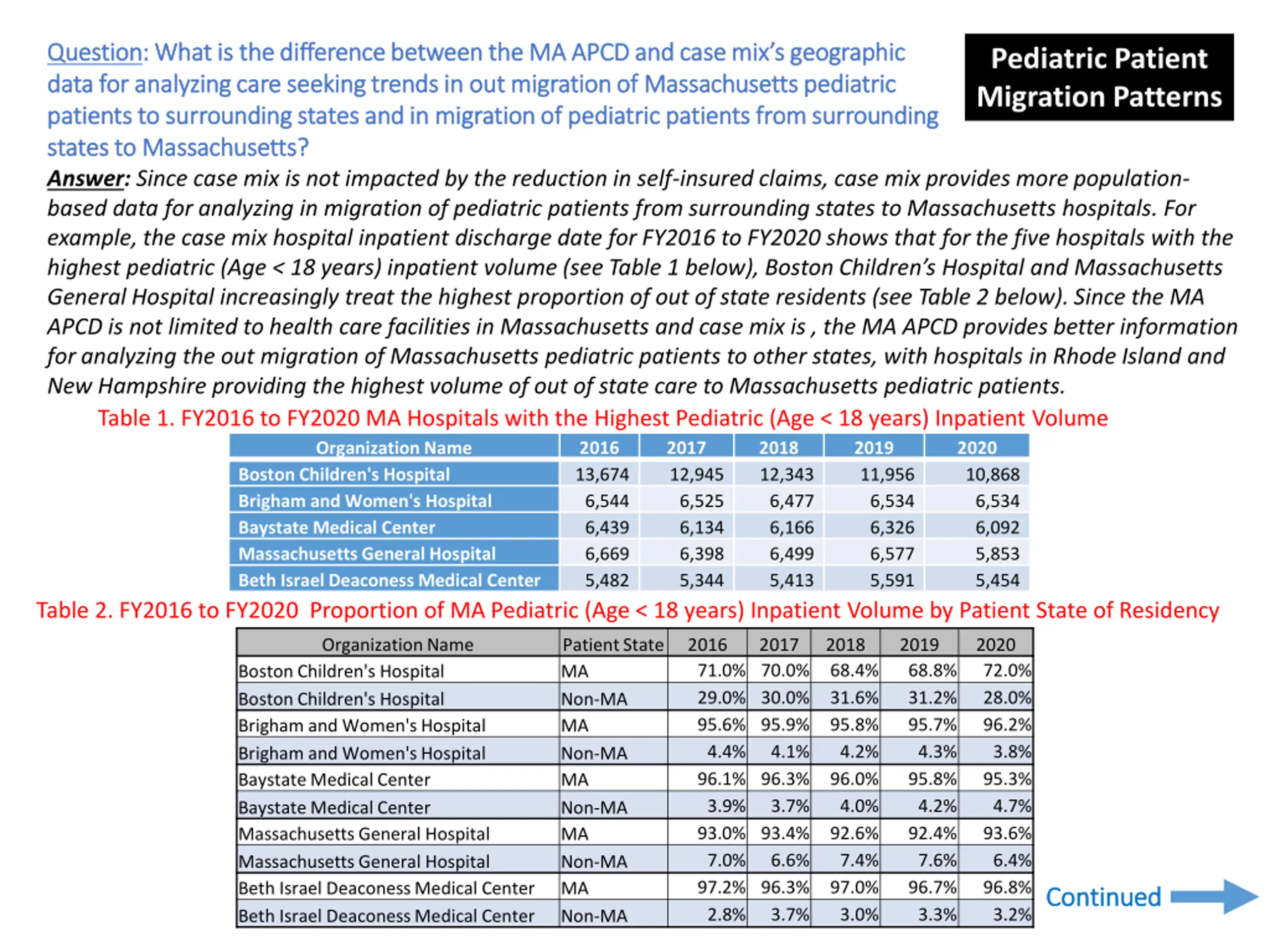 Question Question: What is the difference between the MA APCD and case mix s geographic : What is the difference between the MA APCD and case mix s geographic data for analyzing care seeking trends in out migration of Massachusetts pediatric data for analyzing care seeking trends in out migration of Massachusetts pediatric patients to surrounding states and in migration of pediatric patients from surrounding patients to surrounding states and in migration of pediatric patients from surrounding states to Massachusetts? states to Massachusetts? Answer: Since case mix is not impacted by the reduction in self-insured claims, case mix provides more population- based data for analyzing in migration of pediatric patients from surrounding states to Massachusetts hospitals. For example, the case mix hospital inpatient discharge date for FY2016 to FY2020 shows that for the five hospitals with the highest pediatric (Age < 18 years) inpatient volume (see Table 1 below), Boston Children s Hospital and Massachusetts General Hospital increasingly treat the highest proportion of out of state residents (see Table 2 below). Since the MA APCD is not limited to health care facilities in Massachusetts and case mix is , the MA APCD provides better information for analyzing the out migration of Massachusetts pediatric patients to other states, with hospitals in Rhode Island and New Hampshire providing the highest volume of out of state care to Massachusetts pediatric patients. Table 1. FY2016 to FY2020 MA Hospitals with the Highest Pediatric (Age < 18 years) Inpatient Volume Pediatric Patient Migration Patterns Organization Name Boston Children's Hospital Brigham and Women's Hospital Baystate Medical Center Massachusetts General Hospital Beth Israel Deaconess Medical Center 2016 13,674 6,544 6,439 6,669 5,482 2017 12,945 6,525 6,134 6,398 5,344 2018 12,343 6,477 6,166 6,499 5,413 2019 11,956 6,534 6,326 6,577 5,591 2020 10,868 6,534 6,092 5,853 5,454 Table 2. FY2016 to FY2020 Proportion of MA Pediatric (Age < 18 years) Inpatient Volume by Patient State of Residency Organization Name Patient State MA Non-MA MA Non-MA MA Non-MA MA Non-MA MA Non-MA 2016 71.0% 70.0% 29.0% 30.0% 95.6% 95.9% 4.4% 96.1% 96.3% 3.9% 93.0% 93.4% 7.0% 97.2% 96.3% 2.8% 2017 2018 68.4% 31.6% 95.8% 4.2% 96.0% 4.0% 92.6% 7.4% 97.0% 3.0% 2019 68.8% 31.2% 95.7% 4.3% 95.8% 4.2% 92.4% 7.6% 96.7% 3.3% 2020 72.0% 28.0% 96.2% 3.8% 95.3% 4.7% 93.6% 6.4% 96.8% 3.2% Boston Children's Hospital Boston Children's Hospital Brigham and Women's Hospital Brigham and Women's Hospital Baystate Medical Center Baystate Medical Center Massachusetts General Hospital Massachusetts General Hospital Beth Israel Deaconess Medical Center Beth Israel Deaconess Medical Center 4.1% 3.7% 6.6% Continued Continued 3.7%