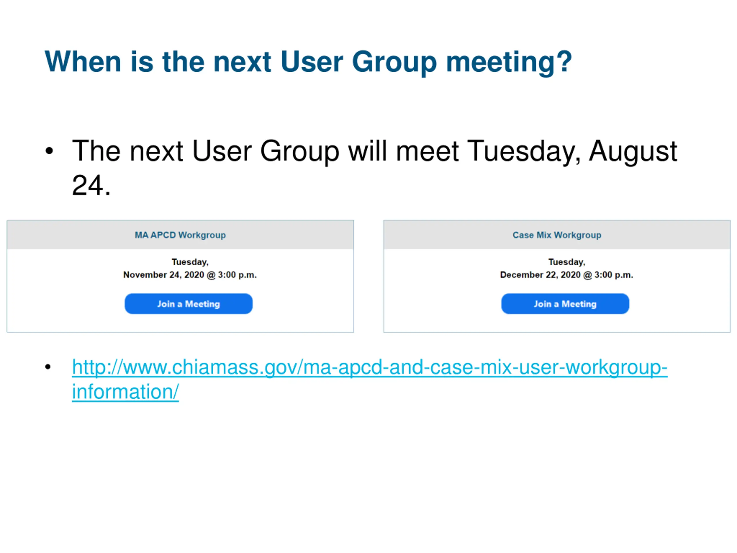 When is the next User Group meeting? The next User Group will meet Tuesday, August 24. http://www.chiamass.gov/ma-apcd-and-case-mix-user-workgroup- information/