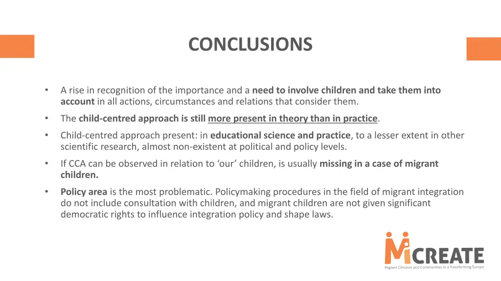 CONCLUSIONS A rise in recognition of the importance and a need to involve children and take them into account in all actions, circumstances and relations that consider them. The child-centred approach is still more present in theory than in practice. Child-centred approach present: in educational science and practice, to a lesser extent in other scientific research, almost non-existent at political and policy levels. If CCA can be observed in relation to our children, is usually missing in a case of migrant children. Policy area is the most problematic. Policymaking procedures in the field of migrant integration do not include consultation with children, and migrant children are not given significant democratic rights to influence integration policy and shape laws.