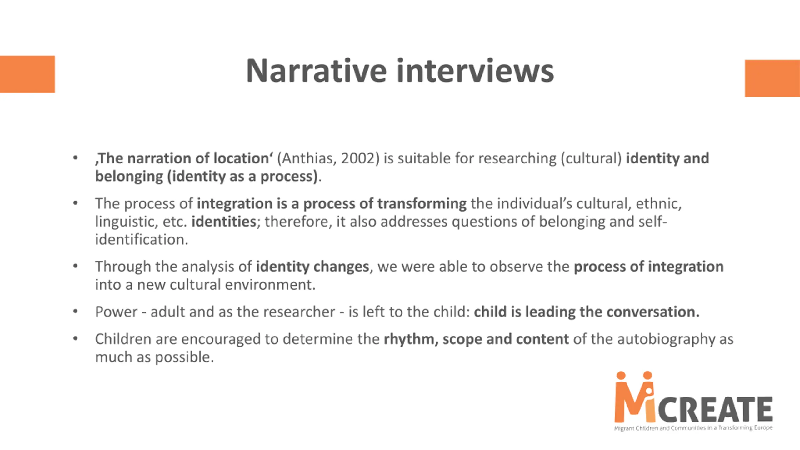 Narrative interviews The narration of location (Anthias, 2002) is suitable for researching (cultural) identity and belonging (identity as a process). The process of integration is a process of transforming the individual s cultural, ethnic, linguistic, etc. identities; therefore, it also addresses questions of belonging and self- identification. Through the analysis of identity changes, we were able to observe the process of integration into a new cultural environment. Power - adult and as the researcher - is left to the child: child is leading the conversation. Children are encouraged to determine the rhythm, scope and content of the autobiography as much as possible.