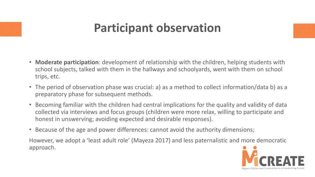 Participant observation Moderate participation: development of relationship with the children, helping students with school subjects, talked with them in the hallways and schoolyards, went with them on school trips, etc. The period of observation phase was crucial: a) as a method to collect information/data b) as a preparatory phase for subsequent methods. Becoming familiar with the children had central implications for the quality and validity of data collected via interviews and focus groups (children were more relax, willing to participate and honest in unswerving; avoiding expected and desirable responses). Because of the age and power differences: cannot avoid the authority dimensions; However, we adopt a least adult role (Mayeza 2017) and less paternalistic and more democratic approach.