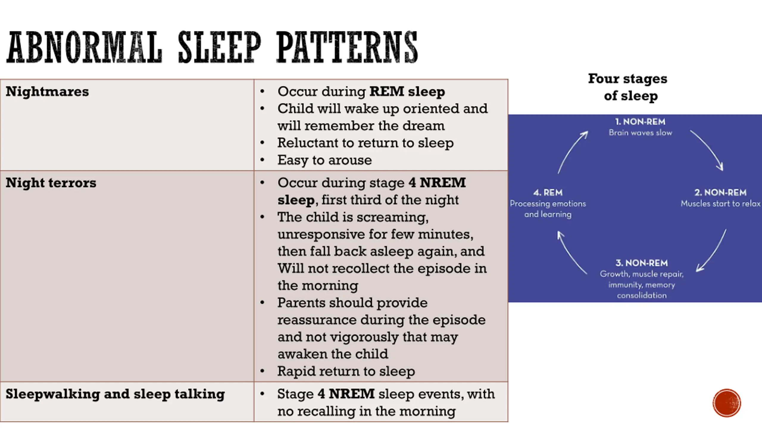ABNORMAL SLEEP PATTERNS Four stages of sleep Nightmares Occur during REM sleep Child will wake up oriented and will remember the dream Reluctant to return to sleep Easy to arouse Occur during stage 4 NREM sleep, first third of the night The child is screaming, unresponsive for few minutes, then fall back asleep again, and Will not recollect the episode in the morning Parents should provide reassurance during the episode and not vigorously that may awaken the child Rapid return to sleep Stage 4 NREM sleep events, with no recalling in the morning >> non-rapid eye movement (NREM) Night terrors Sleepwalking and sleep talking