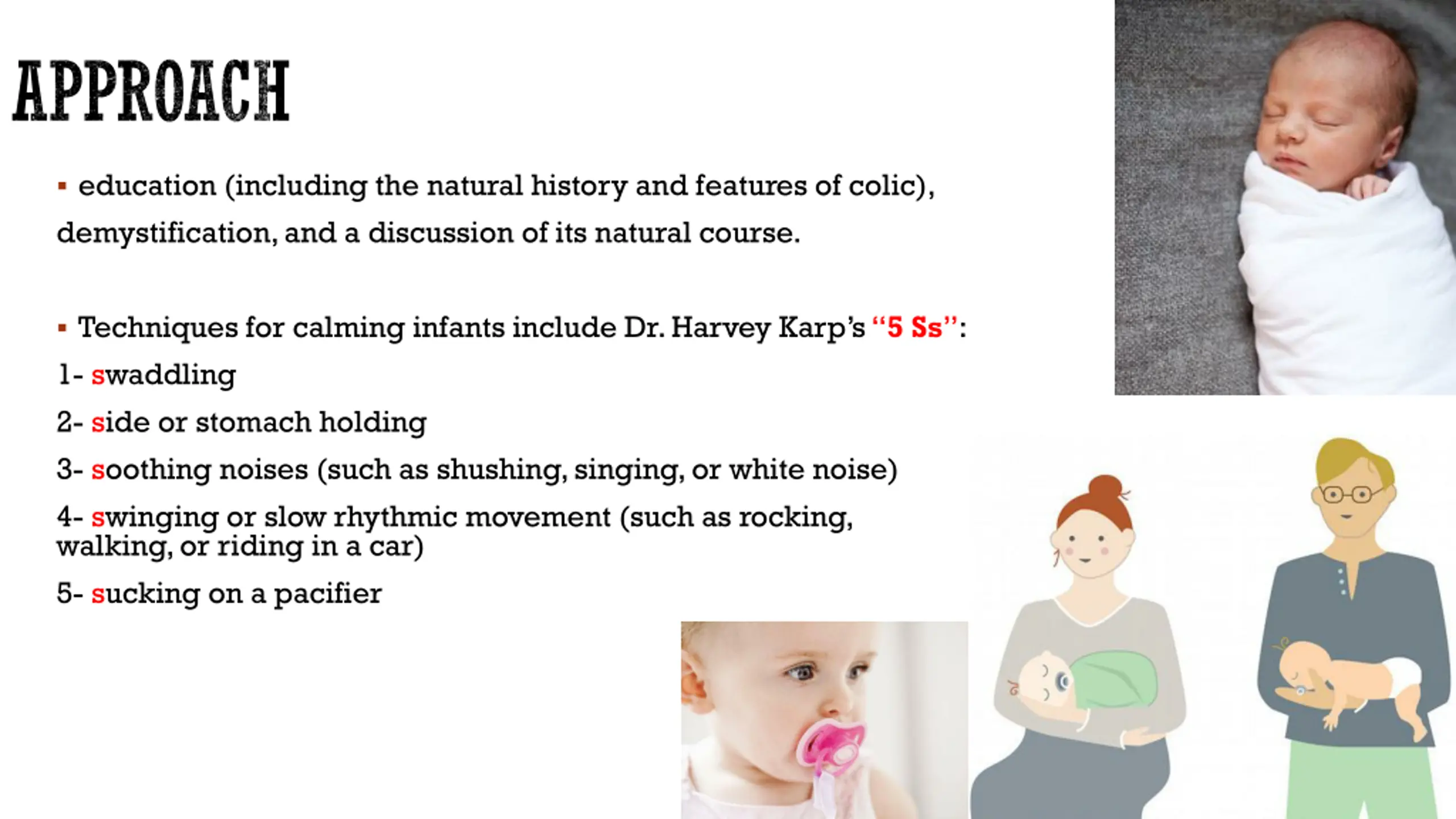 APPROACH education (including the natural history and features of colic), demystification, and a discussion of its natural course. Techniques for calming infants include Dr. Harvey Karp s 5 Ss : 1- swaddling 2- side or stomach holding 3- soothing noises (such as shushing, singing, or white noise) 4- swinging or slow rhythmic movement (such as rocking, walking, or riding in a car) 5- sucking on a pacifier