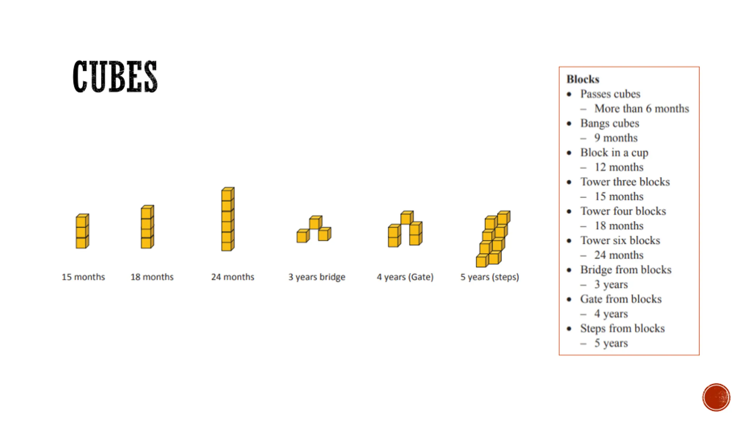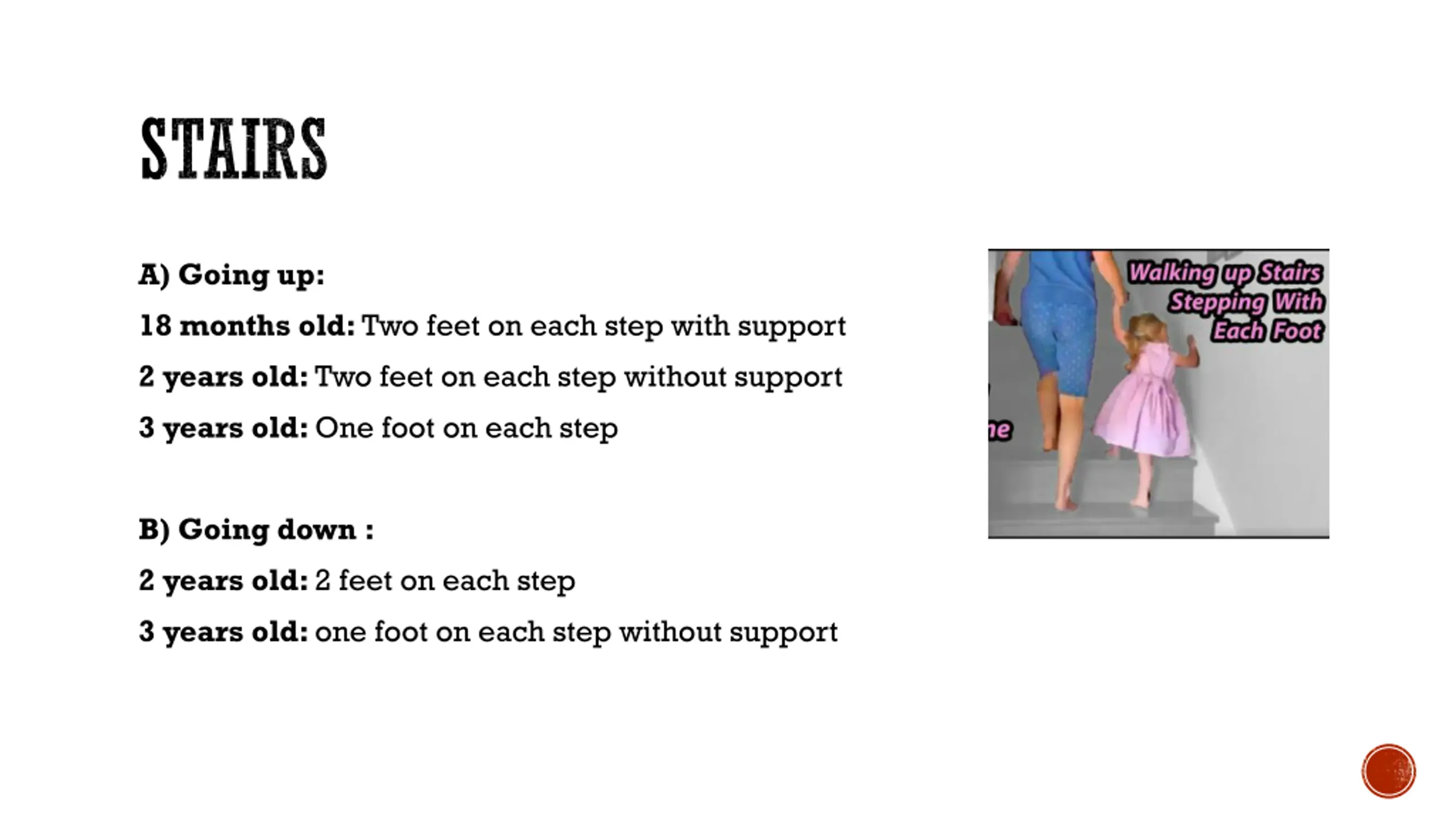 STAIRS A) Going up: 18 months old: Two feet on each step with support 2 years old: Two feet on each step without support 3 years old: One foot on each step B) Going down : 2 years old: 2 feet on each step 3 years old: one foot on each step without support