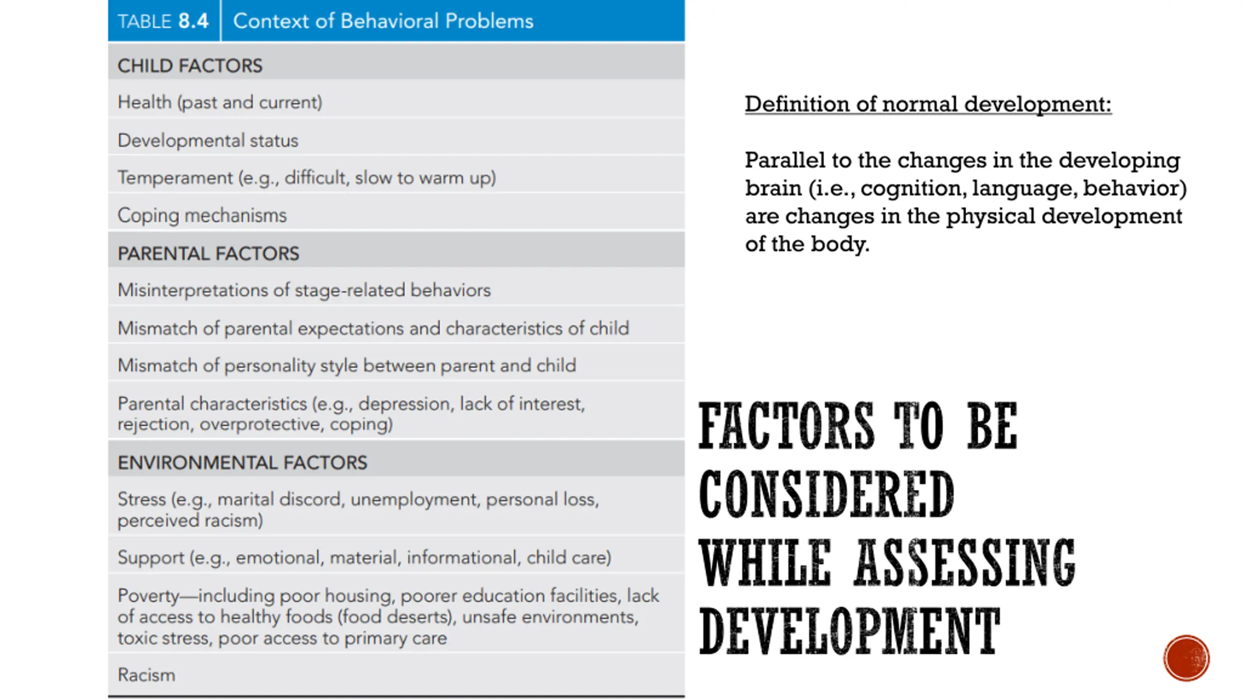 Definition of normal development: Parallel to the changes in the developing brain (i.e., cognition, language, behavior) are changes in the physical development of the body. FACTORS TO BE CONSIDERED WHILE ASSESSING DEVELOPMENT