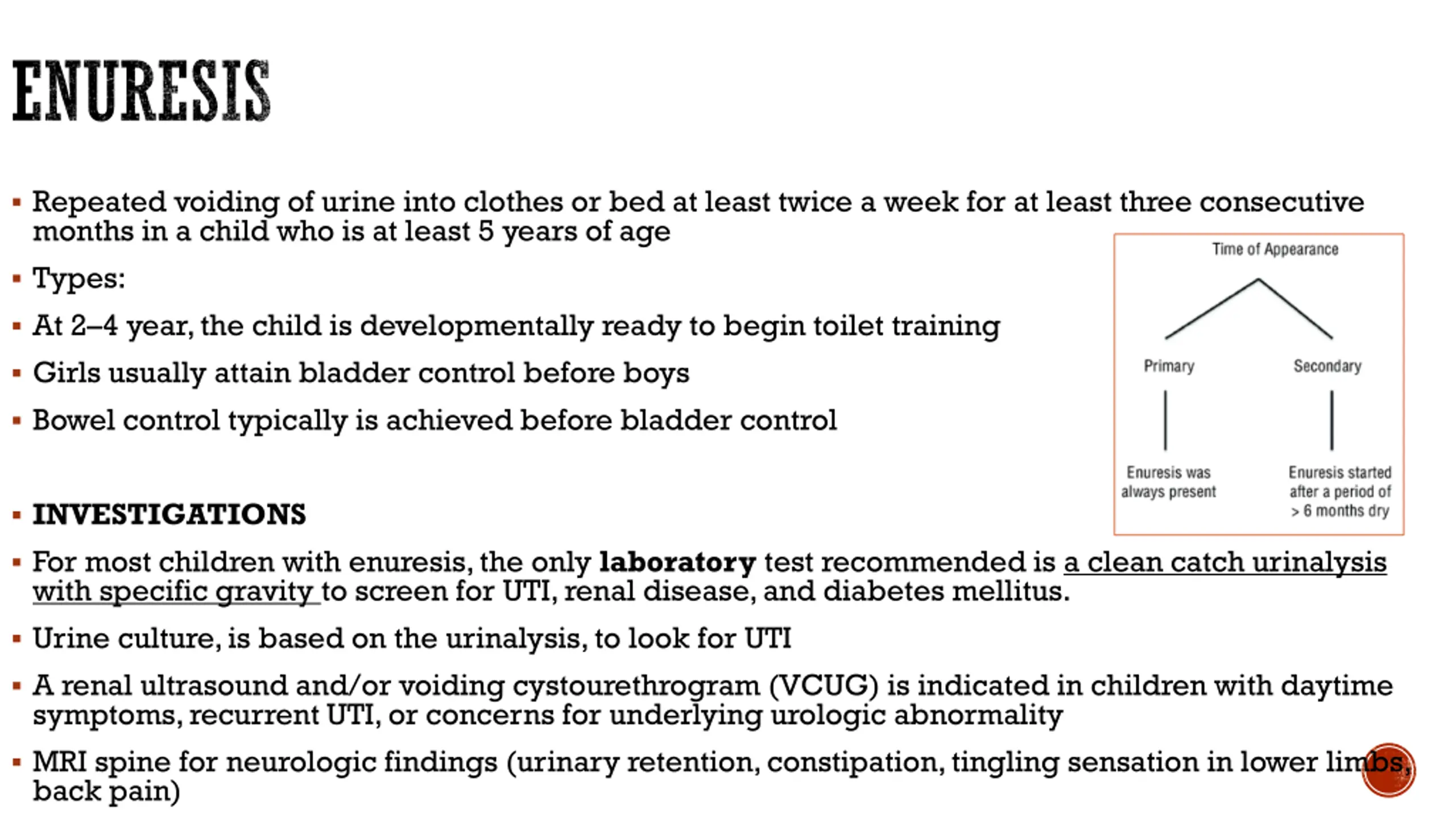 ENURESIS Repeated voiding of urine into clothes or bed at least twice a week for at least three consecutive months in a child who is at least 5 years of age Types: At 2 4 year, the child is developmentally ready to begin toilet training Girls usually attain bladder control before boys Bowel control typically is achieved before bladder control INVESTIGATIONS For most children with enuresis, the only laboratory test recommended is a clean catch urinalysis with specific gravity to screen for UTI, renal disease, and diabetes mellitus. Urine culture, is based on the urinalysis, to look for UTI A renal ultrasound and/or voiding cystourethrogram (VCUG) is indicated in children with daytime symptoms, recurrent UTI, or concerns for underlying urologic abnormality MRI spine for neurologic findings (urinary retention, constipation, tingling sensation in lower limbs, back pain)