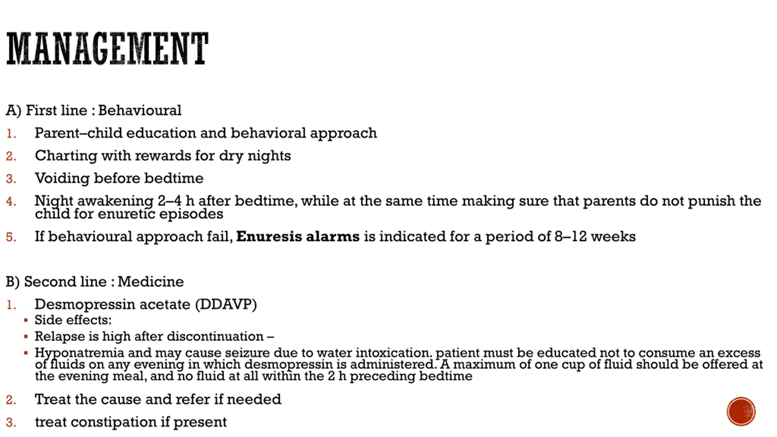 MANAGEMENT A) First line : Behavioural Parent child education and behavioral approach Charting with rewards for dry nights Voiding before bedtime Night awakening 2 4 h after bedtime, while at the same time making sure that parents do not punish the child for enuretic episodes If behavioural approach fail, Enuresis alarms is indicated for a period of 8 12 weeks 1. 2. 3. 4. 5. B) Second line : Medicine Desmopressin acetate (DDAVP) Side effects: Relapse is high after discontinuation Hyponatremia and may cause seizure due to water intoxication. patient must be educated not to consume an excess of fluids on any evening in which desmopressin is administered. A maximum of one cup of fluid should be offered at the evening meal, and no fluid at all within the 2 h preceding bedtime Treat the cause and refer if needed treat constipation if present 1. 2. 3.