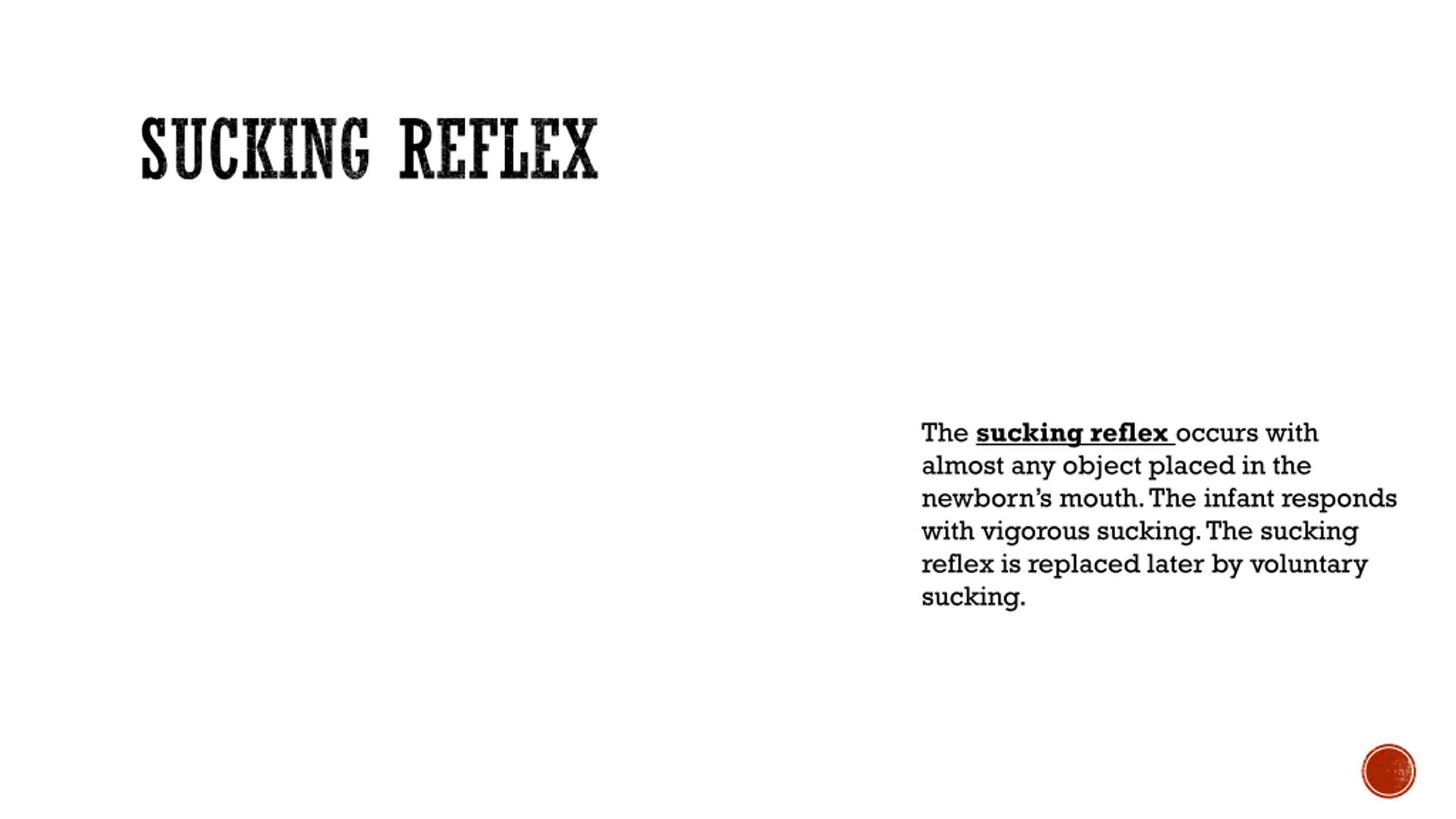 SUCKING REFLEX The sucking reflex occurs with almost any object placed in the newborn s mouth. The infant responds with vigorous sucking. The sucking reflex is replaced later by voluntary sucking.