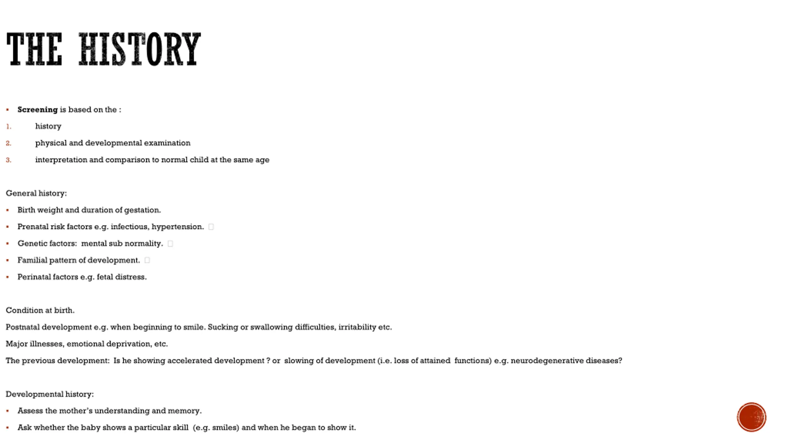 THE HISTORY Screening is based on the : history 1. physical and developmental examination 2. interpretation and comparison to normal child at the same age 3. General history: Birth weight and duration of gestation. Prenatal risk factors e.g. infectious, hypertension. Genetic factors: mental sub normality. Familial pattern of development. Perinatal factors e.g. fetal distress. Condition at birth. Postnatal development e.g. when beginning to smile. Sucking or swallowing difficulties, irritability etc. Major illnesses, emotional deprivation, etc. The previous development: Is he showing accelerated development ? or slowing of development (i.e. loss of attained functions) e.g. neurodegenerative diseases? Developmental history: Assess the mother s understanding and memory. Ask whether the baby shows a particular skill (e.g. smiles) and when he began to show it.