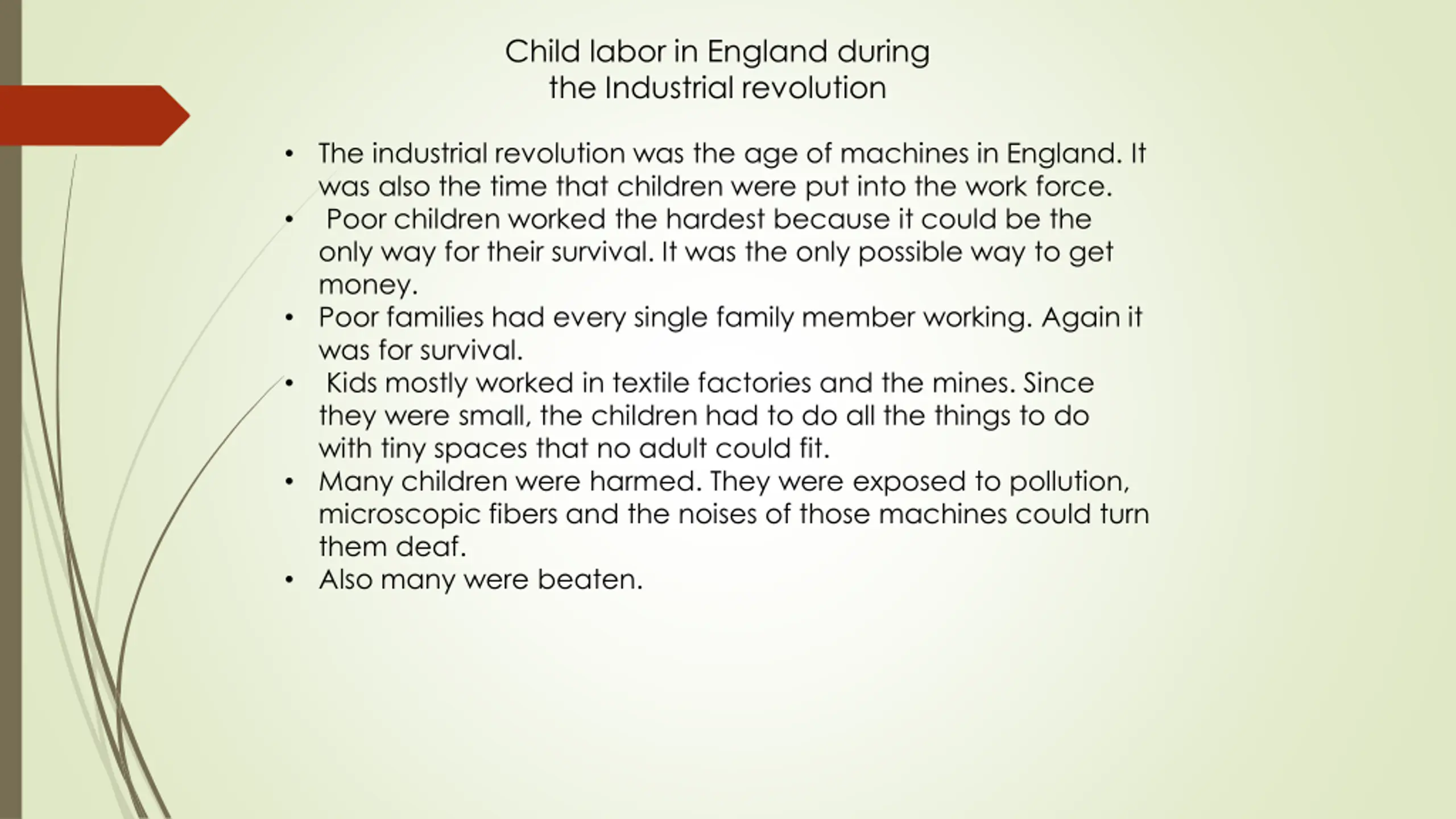 Child labor in England during the Industrial revolution The industrial revolution was the age of machines in England. It was also the time that children were put into the work force. Poor children worked the hardest because it could be the only way for their survival. It was the only possible way to get money. Poor families had every single family member working. Again it was for survival. Kids mostly worked in textile factories and the mines. Since they were small, the children had to do all the things to do with tiny spaces that no adult could fit. Many children were harmed. They were exposed to pollution, microscopic fibers and the noises of those machines could turn them deaf. Also many were beaten.